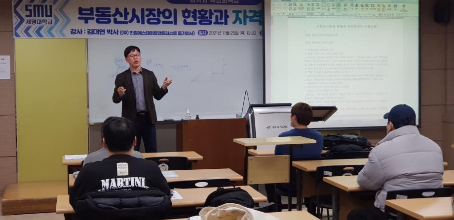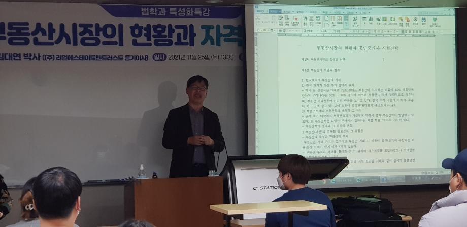 본문 시작 홈으로 커뮤니티 학과안내 교수소개 학과과정 커뮤니티 홈페이지가이드 학과사진첩 공지사항 취업정보 학과사진첩 학과행사 동아리 학생회 교우소식 학과사진첩 페이스북 트위터 프린트 2021. 11. 24 김대연 박사님 특강 법학과 2881 2021-11-25 2021년 11월 24일 (주)리얼이스테이트앤트러스트에서 등기이사을 맡고 계시는 김대연 박사님을 모시고 ' 부동산시장의 현황과 자격증 합격 전략' 이라는 주제로 특강을 진행하였습니다. ※본 특강은 코로나19 방역 수칙을 준수하여 진행하였습니다.※ 목록 이전2021. 11. 24 엄덕수 법무사님 특강 다음 2021 11. 25. 노철우 공인중개사님 특강 담당부서 : 법학과 담당자 : - 연락처 : 043-649-1764 최종수정일 : 2024-10-26 만족도조사 만족도 조사 이 페이지에서 제공하는 정보에 대하여 만족하시나요? 매우만족 만족 보통 불만족 매우불만족