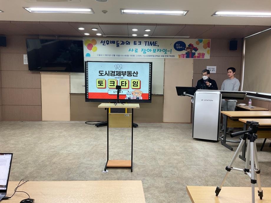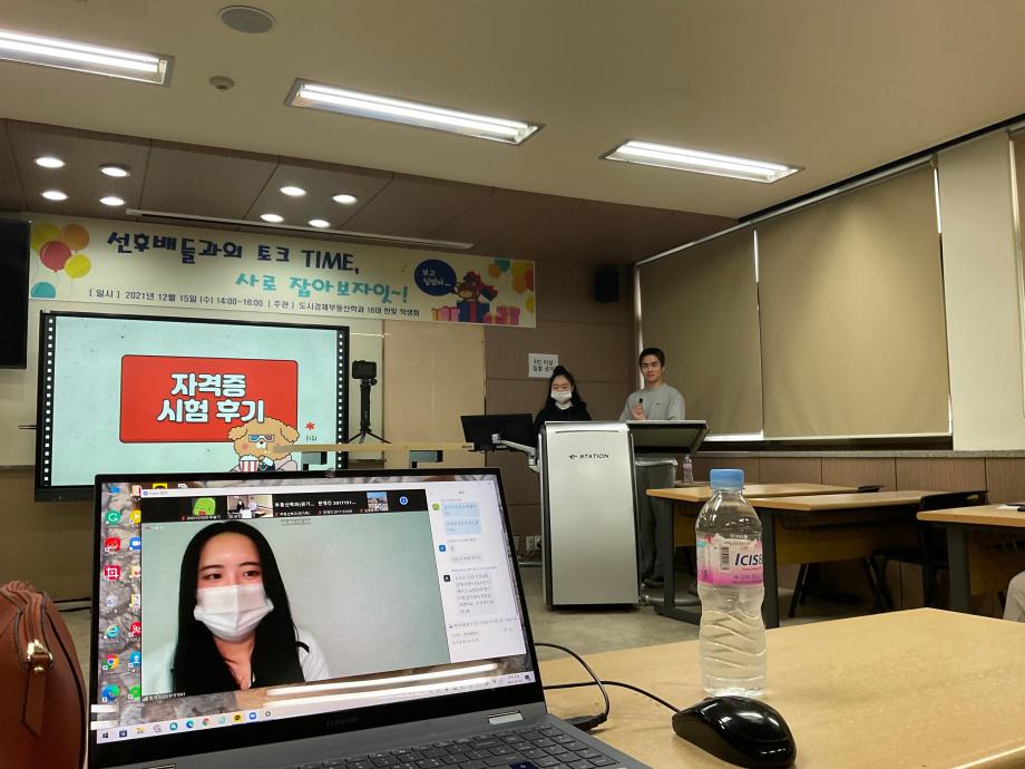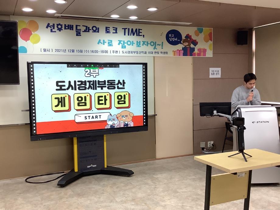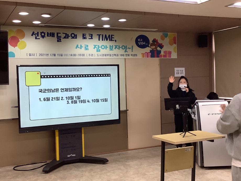 제 16대 한빛 학생회 첫 공식적 행사를 진행을 했습니다. 코로나 여파로 인한 제대로된 학교 생활을 못한 1학년, 2학년을 대상으로 후배와 선배간의 관계를 한층 더 높일 수 있는 자리를 마련해봤습니다. 또한 이번년도 자격증 취득한 학생들의 시험 후기 및 자격증을 공부하는 방법을 알려주는 자리도 있었습니다. 이런 자리로 인해 도시경제 부동산 학과의 분위기와 과 관련의 자격증 및 공부하는 방법을 후배들에게 잘 전달되는 자리가 되었습니다. 당일 행사는 비대면으로 진행하여 코로나 확산으로 대학생활의 어려움이 있었으나 학생들의 적극적인 참여가 있어서 행사 진행에 있어서 한층 더 수월함에 있었습니다.