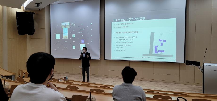 이번에 1차 특강은 건축사무소아라그룹 대표이산 왕정한 대표님께서 '부동산 시장의 개발동향' 주제로 특강을 해주셨습니다. 아파트 시장의 개발동향을 시작으로 오피스텔, 지식산업센트, 물류센터 등 부동산시장에서 가장 수요가 많이 발생하는 형태의 모델들의 개발사례를 중점으로 실무에 대한 엄격하고 확실한 강의를 해주셨습니다. 특강을 처음 접해보는 신입생들 또한 전공에 대한 이해도와 전문성에 대한 확고한 의지가 생겼다고 하여 의미 있었습니다.