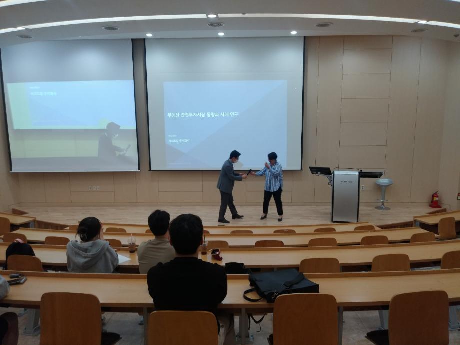 * 내용 : 부동산투자자문회사 저스트알 김우희 대표님께서 부동산자산관리실무에 대하여 특강을 해주셨습니다. 자산관리의 정의와 도시개발의 정의를 아울러 민관합동 공모PF사업에 대하여 구체적인 설명을 해주셨습니다. 학생들은 자산관리 분야의 진로에 대하여 고민할 수 있는 의미있는 시간이였다고 생각합니다. 또한 저스트알에는 도시경제부동산학과 졸업자들또한 근무하고 있는 회사로 학생들이 지원을 적극적으로 하는 회사이기도 합니다.
