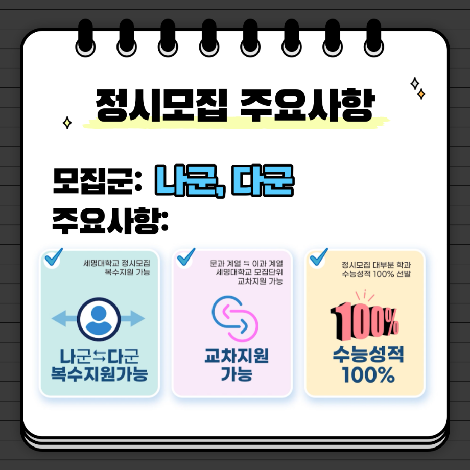 본문 시작 홈으로 학과 소식 학과소개 취업 및 진로 언론 및 보도 학과 소식 대학원 홈페이지가이드 행사사진게시판 행사사진게시판 공지사항 일반자료실 강의자료실 부동산학보 동아리 행사사진게시판 페이스북 트위터 프린트 세명대학교 2024학년도 정시모집 안내 도시경제부동산학과 4201 2023-11-28 [세명대학교 2024학년도 정시모집 안내] *원서접수 기간 : 2024.1.3. ~ 1.6 *정시모집 주요사항 모집군 : 나군 ,다군 주요사항 : 나군-다군 복수지원가능 교차지원 지원 (문과계열, 이과계열 교차지원 가능) 수능성적 100% 모든 전형에서 학생부(교과 및 비교과) 미반영 목록 이전수시모집 합격자(최초 및 충원) 등록안내 이전2023 (사)한국지적학회 추계학술대회 개최 담당부서 : 부동산지적학과 담당자 : - 연락처 : 043-649-1784 최종수정일 : 2024-10-26 만족도조사 만족도 조사 이 페이지에서 제공하는 정보에 대하여 만족하시나요? 매우만족 만족 보통 불만족 매우불만족