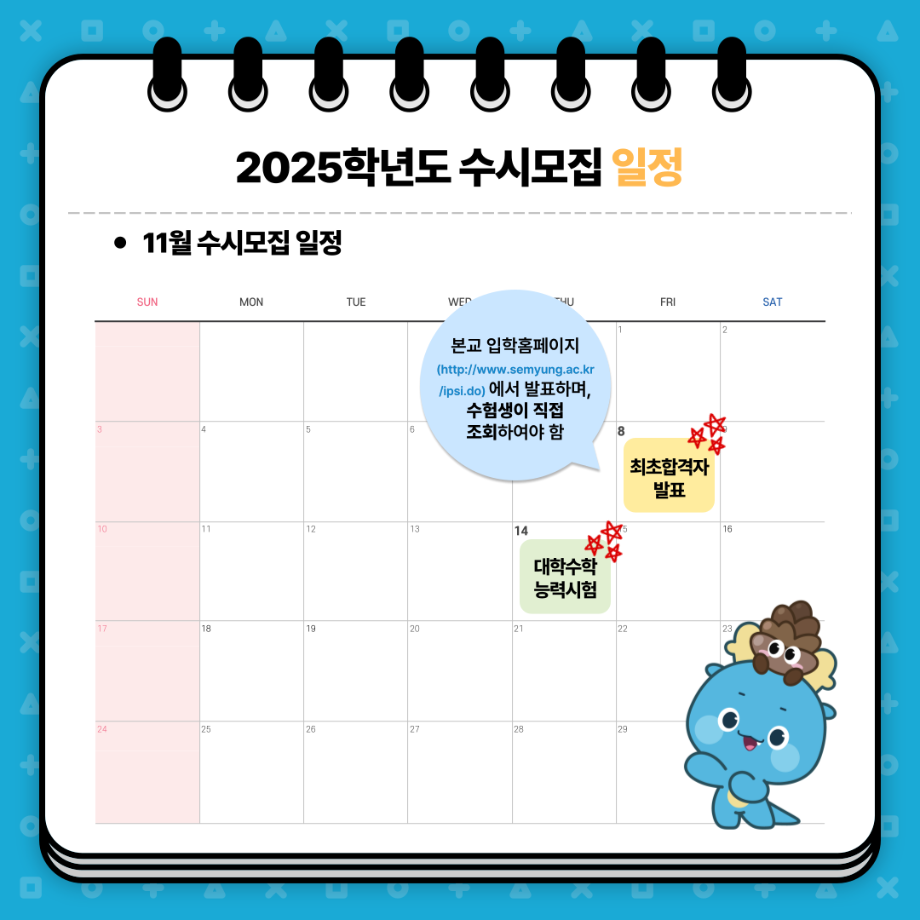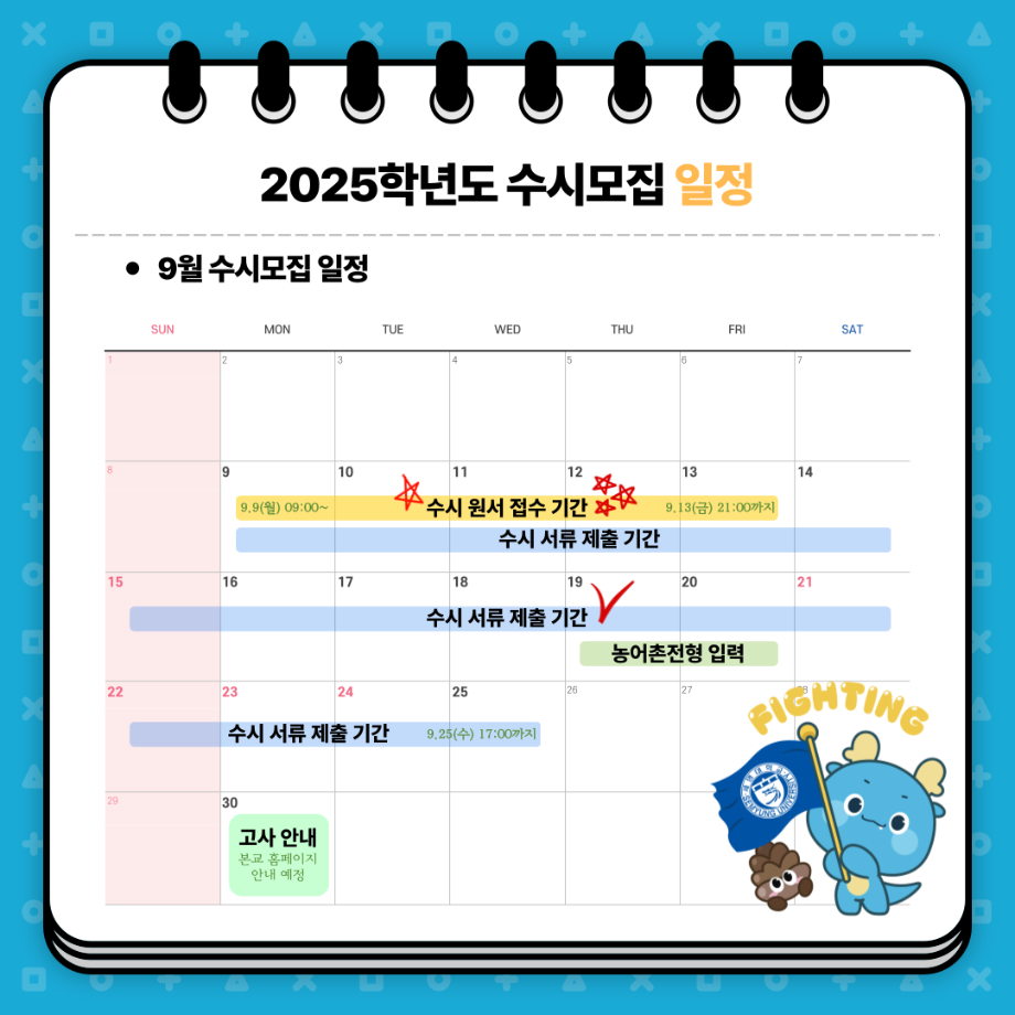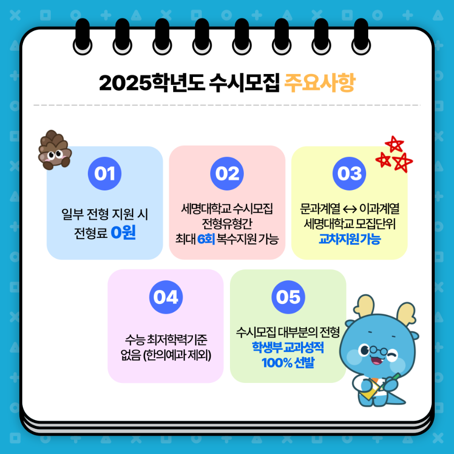 본문 시작 홈으로 학과 소식 학과소개 취업 및 진로 언론 및 보도 학과 소식 대학원 홈페이지가이드 행사사진게시판 행사사진게시판 공지사항 일반자료실 강의자료실 부동산학보 동아리 행사사진게시판 페이스북 트위터 프린트 세명대학교 2025학년도 수시모집 안내 부동산지적학과 2992 2024-08-19 세명대학교 2025학년도 수시모집 주요사항 안내 예비 세명인들 주목~!! 수시모집 주요사항부터 9월, 10월, 11월 일정까지! ✨세명대학교 2025학년도 수시모집 주요사항✨을 안내합니다 9월 9일부터 13일! 수시 원서 접수하고 💙재미있는 경험 가득한 세명대💙에서 만나요! 목록 다음 2025년도 수시모집 원서접수 다음 부동산지적학과 완전분석 담당부서 : 부동산지적학과 담당자 : - 연락처 : 043-649-1784 최종수정일 : 2024-10-26 만족도조사 만족도 조사 이 페이지에서 제공하는 정보에 대하여 만족하시나요? 매우만족 만족 보통 불만족 매우불만족