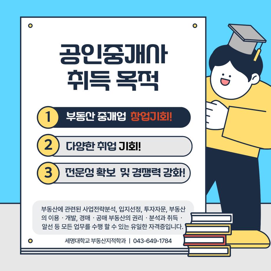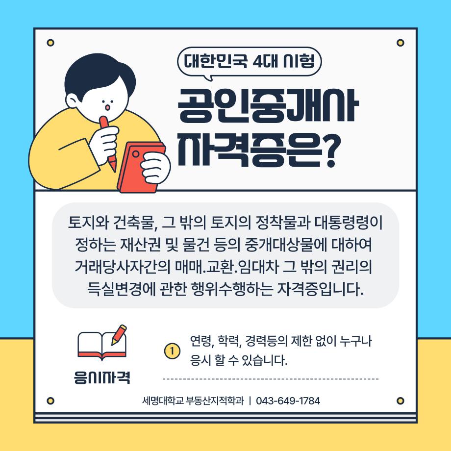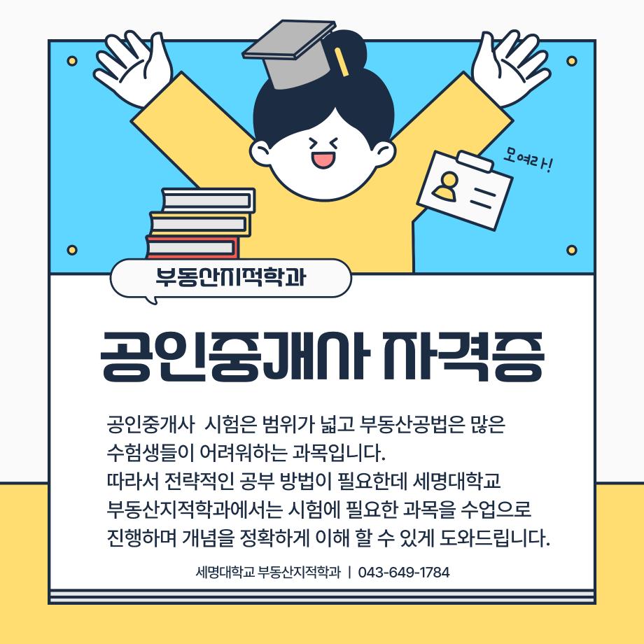 본문 시작 홈으로 학과 소식 학과소개 취업 및 진로 언론 및 보도 학과 소식 대학원 홈페이지가이드 행사사진게시판 행사사진게시판 공지사항 일반자료실 강의자료실 부동산학보 동아리 행사사진게시판 페이스북 트위터 프린트 공인중개사 소개카드 부동산지적학과 2311 2024-11-20 공인중개사 소개 카드입니다. 공인중개사에 관심있는 학생들은 참고하여 주세요. 목록 이전2024학년도 제 35회 부동산지적학과 학술특강 다음 지적기사 소개 카드 담당부서 : 부동산지적학과 담당자 : - 연락처 : 043-649-1784 최종수정일 : 2024-10-26 만족도조사 만족도 조사 이 페이지에서 제공하는 정보에 대하여 만족하시나요? 매우만족 만족 보통 불만족 매우불만족
