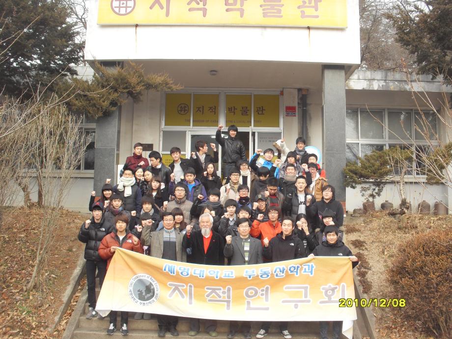 부동산학과는 2010년 12월 8일(수)오후 학과 전공동아리인 지적연구회 권기욱∙김행종 지도교수와 동아리 회원 30여명이 제천시 소재 지적박물관을 방문하였다. 이날 리진호 박물관장님으로부터 지적사에 관한 특강과 지적박물관의 현황 및 박물관 시설, 사료 및 유물 등에 관하여 자세한 설명과 안내를 받았다. 이번 현장교육을 통해 부동산학과 학생들은 강의실에서의 지적이론의 교육과 더불어 실무교육의 직간접 학습효과가 기대되며 나아가 학과수업의 이해력 증진에 많은 도움을 줄 것으로 기대된다.