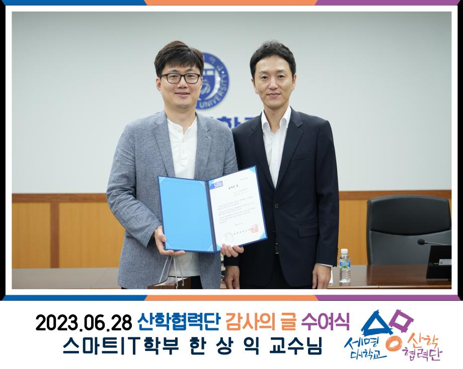 세명대학교 스마트IT학부 한상익 교수는 2023년 6월 28일(수) 세명대학교 산학협력단에서 3천만원 이상의 과제를 수주한 교원에게 주는 감사의 글을 수여하였다.