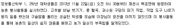 본문 시작 홈으로 SMIT 소식 SMIT 소개 SMIT 교육 SMIT 취업 SMIT 소식 SMIT 입학 홈페이지가이드 갤러리 공지사항 갤러리 경진대회 동아리 갤러리 페이스북 트위터 프린트 정보통신학부 봉사활동 정보통신학부 7101 2013-12-03 정보통신학부, ETRI&KISTI 견학 목록 이전정보통신학부, 농촌 봉사활동 실시 다음 정보통신학부, 취업박람회 견학 담당부서 : 스마트IT학부 담당자 : - 연락처 : 043-649-1275 최종수정일 : 2024-10-26 만족도조사 만족도 조사 이 페이지에서 제공하는 정보에 대하여 만족하시나요? 매우만족 만족 보통 불만족 매우불만족