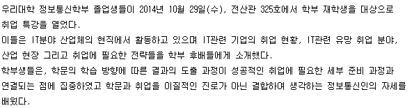 본문 시작 홈으로 SMIT 소식 SMIT 소개 SMIT 교육 SMIT 취업 SMIT 소식 SMIT 입학 홈페이지가이드 갤러리 공지사항 갤러리 경진대회 동아리 갤러리 페이스북 트위터 프린트 정보통신학부, 월악산 국립공원 정화활동 실시 오선진 6377 2014-11-06 정보통신학부, 월악산 국립공원 정화활동 실시 목록 이전정보통신학부, 취업 전략을 위한 졸업생 특강 개최 다음 한방-의료ICT융합사업단 튜터링 오리엔테이션 진행 담당부서 : 스마트IT학부 담당자 : - 연락처 : 043-649-1275 최종수정일 : 2024-10-26 만족도조사 만족도 조사 이 페이지에서 제공하는 정보에 대하여 만족하시나요? 매우만족 만족 보통 불만족 매우불만족