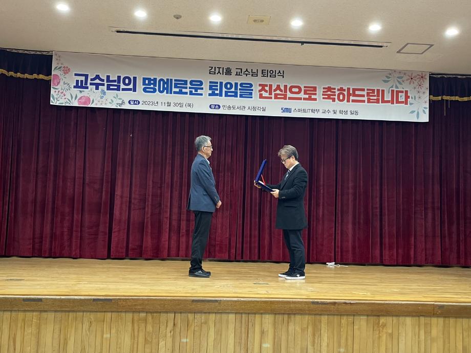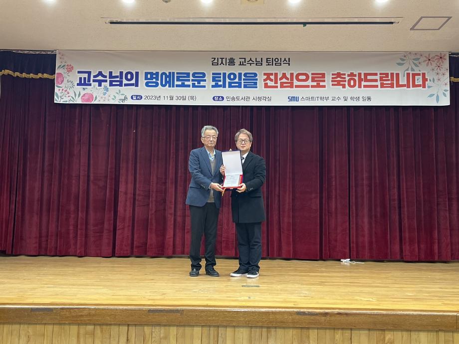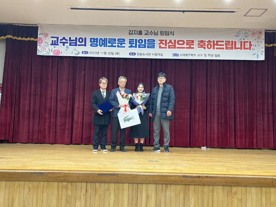 본문 시작 홈으로 SMIT 소식 SMIT 소개 SMIT 교육 SMIT 취업 SMIT 소식 SMIT 입학 홈페이지가이드 갤러리 공지사항 갤러리 경진대회 동아리 갤러리 페이스북 트위터 프린트 김지홍 교수님 퇴임식 진행 스마트IT학부 2810 2023-12-04 2023.11.30(목)에 스마트IT학부 김지홍 교수님의 명예로운 퇴임식이 시행 되었다. 본 행사는 <캡스톤 디자인 중간 발표회> 행사가 끝난 후 진행 되었다. 학생들의 영상편지와 재직 기념패 증정 및 꽃다발 증정으로 이루어졌다. 김지홍 교수님의 퇴임사와 권혁민 교수님의 축하 인사말이 있었다. 스마트IT학부 재학생들과 교수님들은 진심으로 김지홍 교수님의 명예로운 퇴임을 축하 하였다. 목록 이전스마트IT학부 캡스톤디자인 중간발표회 시행 다음 2023학년도 총장표창 수상 ! 담당부서 : 스마트IT학부 담당자 : - 연락처 : 043-649-1275 최종수정일 : 2024-10-26 만족도조사 만족도 조사 이 페이지에서 제공하는 정보에 대하여 만족하시나요? 매우만족 만족 보통 불만족 매우불만족