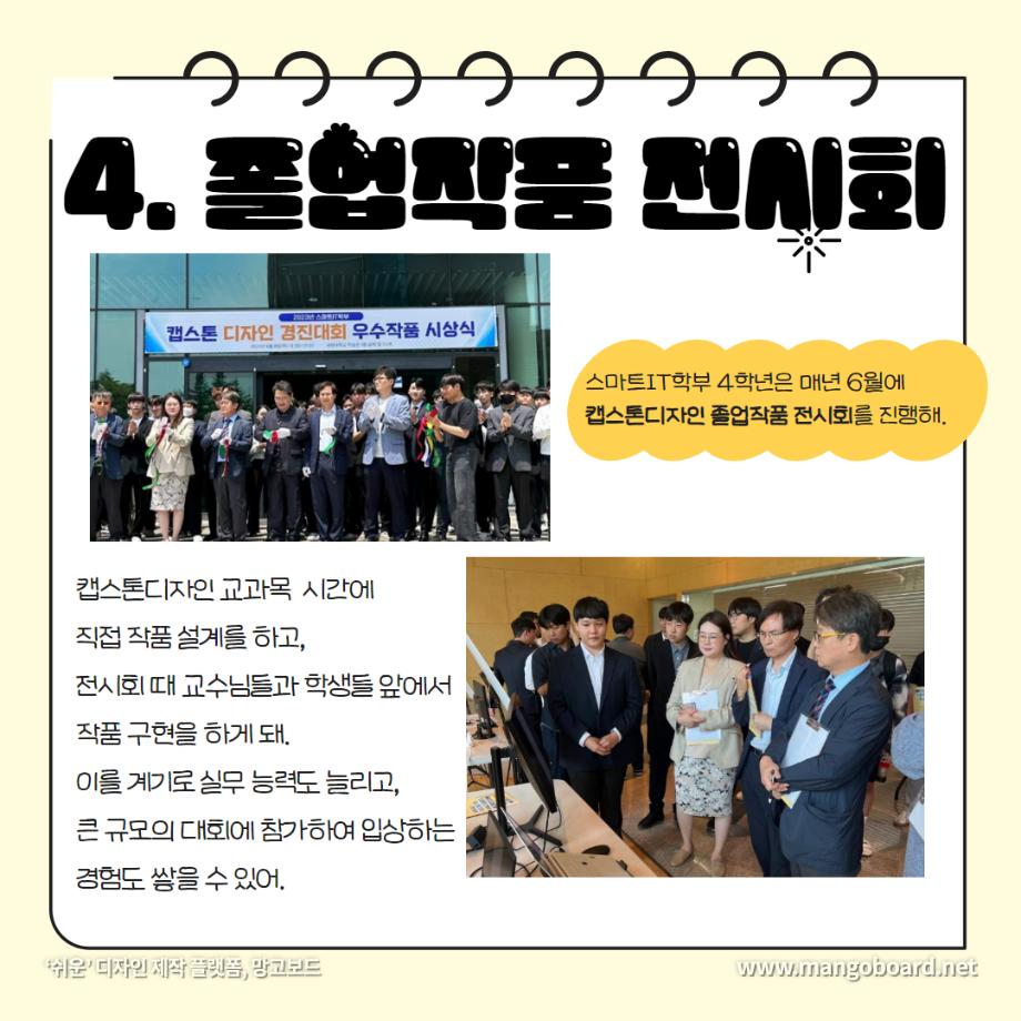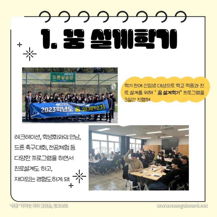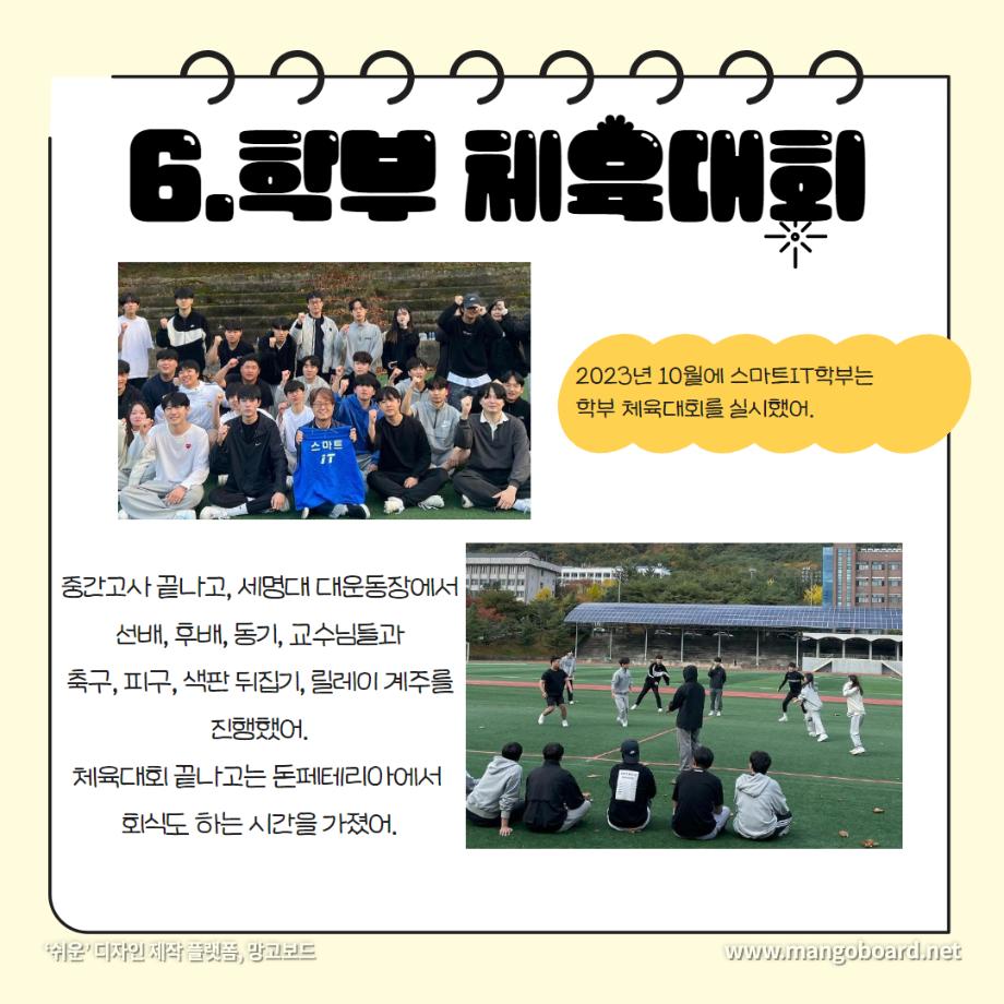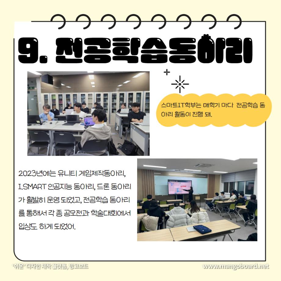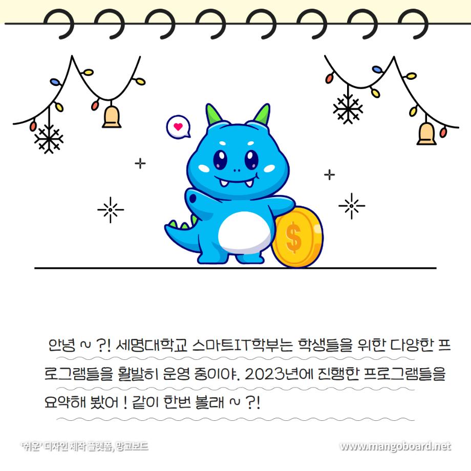 본문 시작 홈으로 SMIT 소식 SMIT 소개 SMIT 교육 SMIT 취업 SMIT 소식 SMIT 입학 홈페이지가이드 갤러리 공지사항 갤러리 경진대회 동아리 갤러리 페이스북 트위터 프린트 세명대학교 스마트IT학부는 이런 활동을 한다 ❗ 스마트IT학부 2002 2024-01-04 세명대학교 스마트IT학부는 이런 활동을 한다 ❗ 안녕하세요. 세명대학교 스마트IT학부입니다. 😍 2023년도에 진행한 스마트IT학부의 유익하고 즐거웠던 프로그램들 함께 보실까요 ?!😊 세명대 스마트IT학부는 재학생들을 위한 다양하고 재미있는 프로그램들이 활발히 운영하고 있습니다. ❤️ 목록 이전2023-2학기 드론 동아리 시행🎈 다음 실무경험 ? 자격증? 취업 All in 세명대학교 스마트IT학부 담당부서 : 스마트IT학부 담당자 : - 연락처 : 043-649-1275 최종수정일 : 2024-10-26 만족도조사 만족도 조사 이 페이지에서 제공하는 정보에 대하여 만족하시나요? 매우만족 만족 보통 불만족 매우불만족