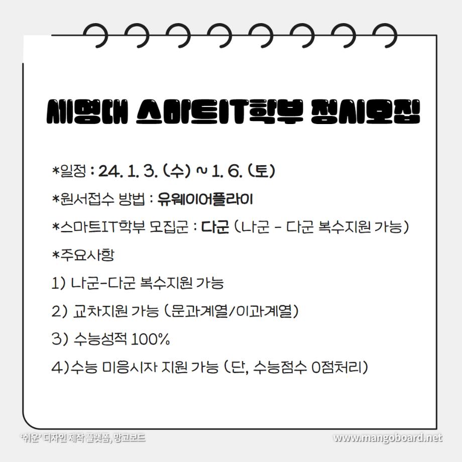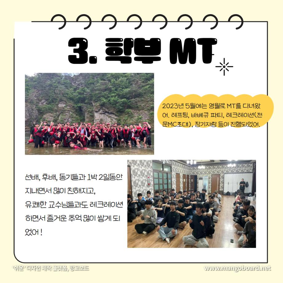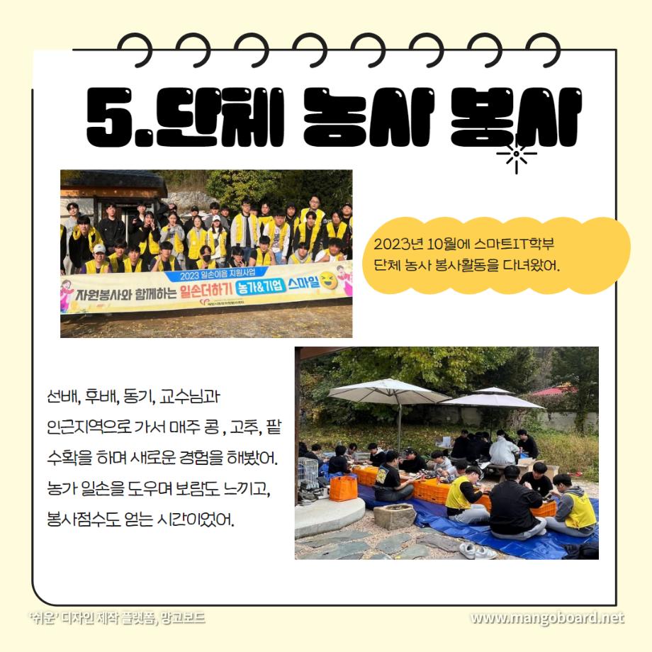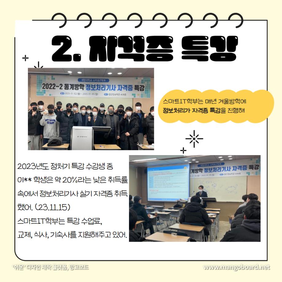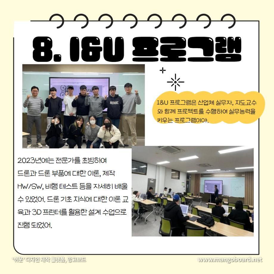 본문 시작 홈으로 SMIT 소식 SMIT 소개 SMIT 교육 SMIT 취업 SMIT 소식 SMIT 입학 홈페이지가이드 갤러리 공지사항 갤러리 경진대회 동아리 갤러리 페이스북 트위터 프린트 세명대학교 스마트IT학부는 이런 활동을 한다 ❗ 스마트IT학부 2002 2024-01-04 세명대학교 스마트IT학부는 이런 활동을 한다 ❗ 안녕하세요. 세명대학교 스마트IT학부입니다. 😍 2023년도에 진행한 스마트IT학부의 유익하고 즐거웠던 프로그램들 함께 보실까요 ?!😊 세명대 스마트IT학부는 재학생들을 위한 다양하고 재미있는 프로그램들이 활발히 운영하고 있습니다. ❤️ 목록 이전2023-2학기 드론 동아리 시행🎈 다음 실무경험 ? 자격증? 취업 All in 세명대학교 스마트IT학부 담당부서 : 스마트IT학부 담당자 : - 연락처 : 043-649-1275 최종수정일 : 2024-10-26 만족도조사 만족도 조사 이 페이지에서 제공하는 정보에 대하여 만족하시나요? 매우만족 만족 보통 불만족 매우불만족