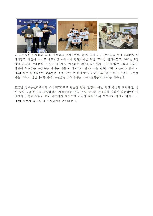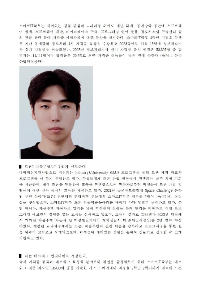 본문 시작 홈으로 SMIT 소식 SMIT 소개 SMIT 교육 SMIT 취업 SMIT 소식 SMIT 입학 홈페이지가이드 갤러리 공지사항 갤러리 경진대회 동아리 갤러리 페이스북 트위터 프린트 실무경험 ? 자격증? 취업 All in 세명대학교 스마트IT학부 스마트IT학부 2129 2024-01-04 안녕하세요. 세명대학교 스마트IT학부입니다. 스마트IT학부 보도자료 내용입니다. 실무경험? 자격증? 취업? All in 세명대학교 스마트IT학부! -실무능력을 중심으로 교과과정 개편 -자격증? 어려워도 우리는 자신있다 ! -드론? 자율주행차? 우리가 선도한다 -나는 네트워크 엔지니어로 성장한다. 목록 이전세명대학교 스마트IT학부는 이런 활동을 한다 ❗ 다음 동계방학 특별활동 “정보처리기사 자격증 특강” 실시!📚 담당부서 : 스마트IT학부 담당자 : - 연락처 : 043-649-1275 최종수정일 : 2024-10-26 만족도조사 만족도 조사 이 페이지에서 제공하는 정보에 대하여 만족하시나요? 매우만족 만족 보통 불만족 매우불만족
