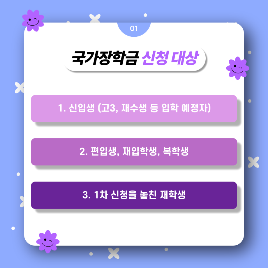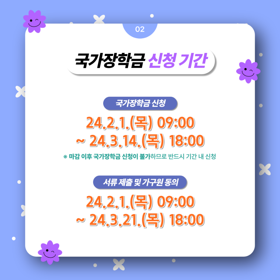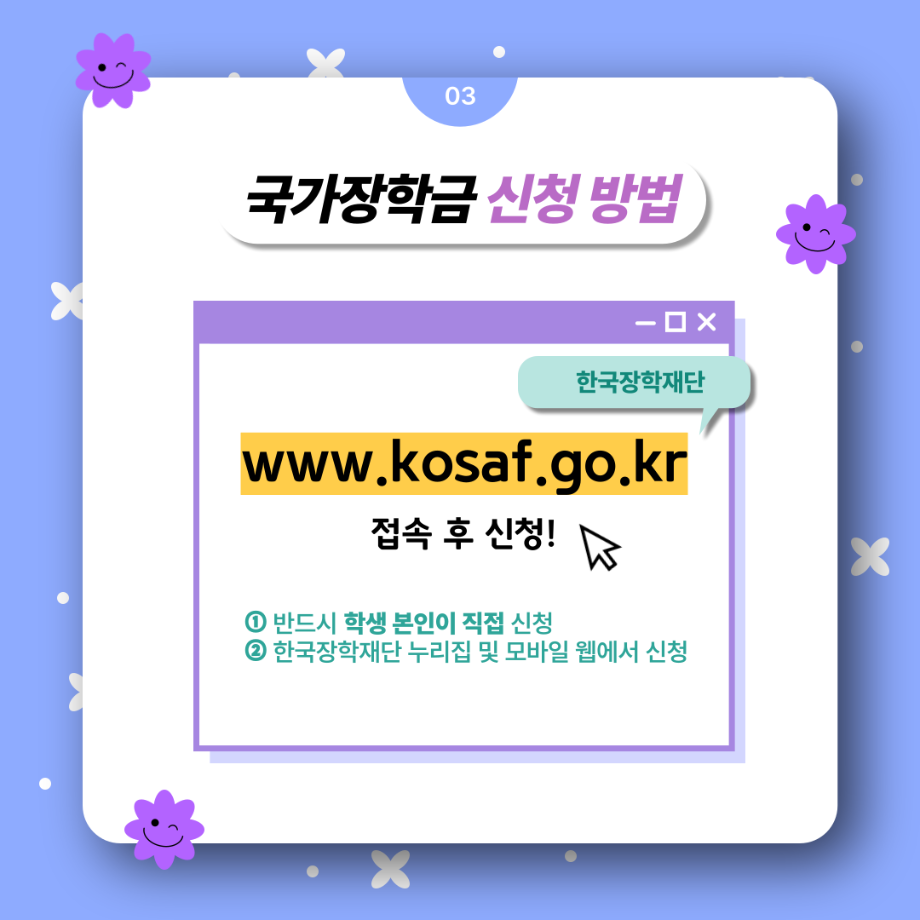 본문 시작 홈으로 SMIT 소식 SMIT 소개 SMIT 교육 SMIT 취업 SMIT 소식 SMIT 입학 홈페이지가이드 갤러리 공지사항 갤러리 경진대회 동아리 갤러리 페이스북 트위터 프린트 여러분! 국가장학금 2차 신청하세요! 스마트IT학부 1991 2024-02-23 여러분! 국가장학금 2차 신청하세요! ✔ 내가 세명대학교 신입생이라면! ✔ 내가 편입생, 재입학생, 복학생이라면! ✔ 내가 1차 신청을 놓쳤다면! 📌 24년 2월 1일(목) 09:00부터 3월 24일(목) 18:00까지 ✨ 한국장학재단 사이트에서 신청하세요! 목록 이전2024년도 꿈설계학기 2일차 다음 2024학년도 추가모집 주요사항 담당부서 : 스마트IT학부 담당자 : - 연락처 : 043-649-1275 최종수정일 : 2024-10-26 만족도조사 만족도 조사 이 페이지에서 제공하는 정보에 대하여 만족하시나요? 매우만족 만족 보통 불만족 매우불만족