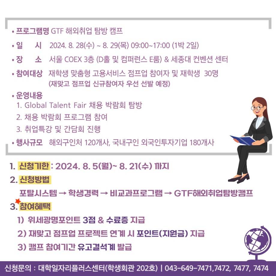 본문 시작 홈으로 SMIT 소식 SMIT 소개 SMIT 교육 SMIT 취업 SMIT 소식 SMIT 입학 홈페이지가이드 갤러리 공지사항 갤러리 경진대회 동아리 갤러리 페이스북 트위터 프린트 📢 GTF해외취업탐방&캠프 안내 스마트IT학부 1554 2024-08-05 (확성기)안녕하세요, 대학일자리플러스센터 재맞고팀 입니다. 현재, 8/28(수)~29(목)에 진행되는 'GTF해외취업탐방&캠프' 신청자 모집 중에 있습니다. 본 프로그램은 1박 2일로 진행되며, 위세광명포인트 지급 및 유고결석계가 발급됩니다. 또한, 재학생맞춤형고용서비스 점프업 프로젝트 연계 시 프로그램 종료 후 지원금(20만원) 지급 예정입니다. 많은 관심과 참여 부탁드립니다!! 목록 이전★2024학년도 2학기 팝업스토어 신청자 모집★ 다음 [보도자료] 세명대학교 스마트IT학부 "드론코더 300 프로젝트 방학프로그램" 담당부서 : 스마트IT학부 담당자 : - 연락처 : 043-649-1275 최종수정일 : 2024-10-26 만족도조사 만족도 조사 이 페이지에서 제공하는 정보에 대하여 만족하시나요? 매우만족 만족 보통 불만족 매우불만족