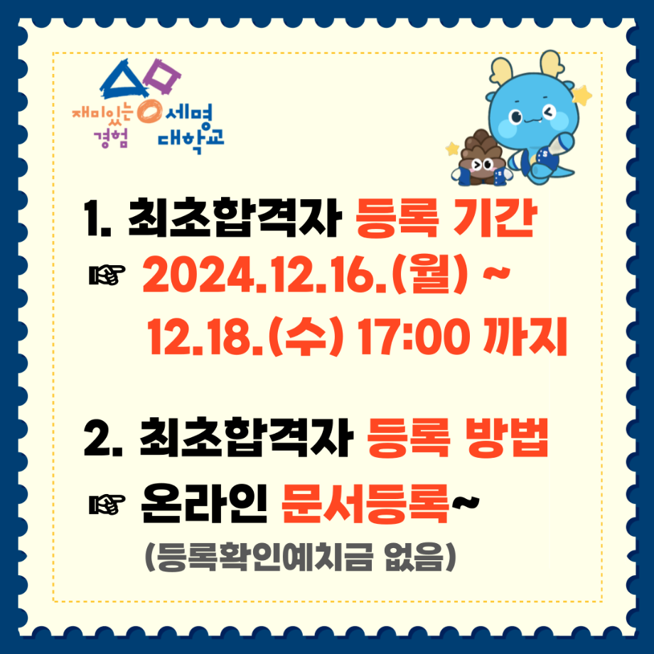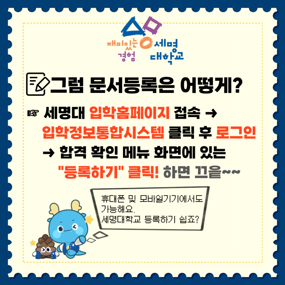 본문 시작 홈으로 SMIT 소식 SMIT 소개 SMIT 교육 SMIT 취업 SMIT 소식 SMIT 입학 홈페이지가이드 갤러리 공지사항 갤러리 경진대회 동아리 갤러리 페이스북 트위터 프린트 수시모집 최초 합격자 발표 안내 스마트IT학부 1389 2024-12-17 수시모집 최초 합격자 발표 안내 입니다!! 자세한 내용은 세명대학교 입학홈페이지 참고 (https://ipsi.semyung.ac.kr/) 목록 이전◈ 스마트IT학부 졸업작품 중간발표회 진행 다음 2025학년도 수시모집 충원합격자 발표/등록 안내 담당부서 : 스마트IT학부 담당자 : - 연락처 : 043-649-1275 최종수정일 : 2024-10-26 만족도조사 만족도 조사 이 페이지에서 제공하는 정보에 대하여 만족하시나요? 매우만족 만족 보통 불만족 매우불만족