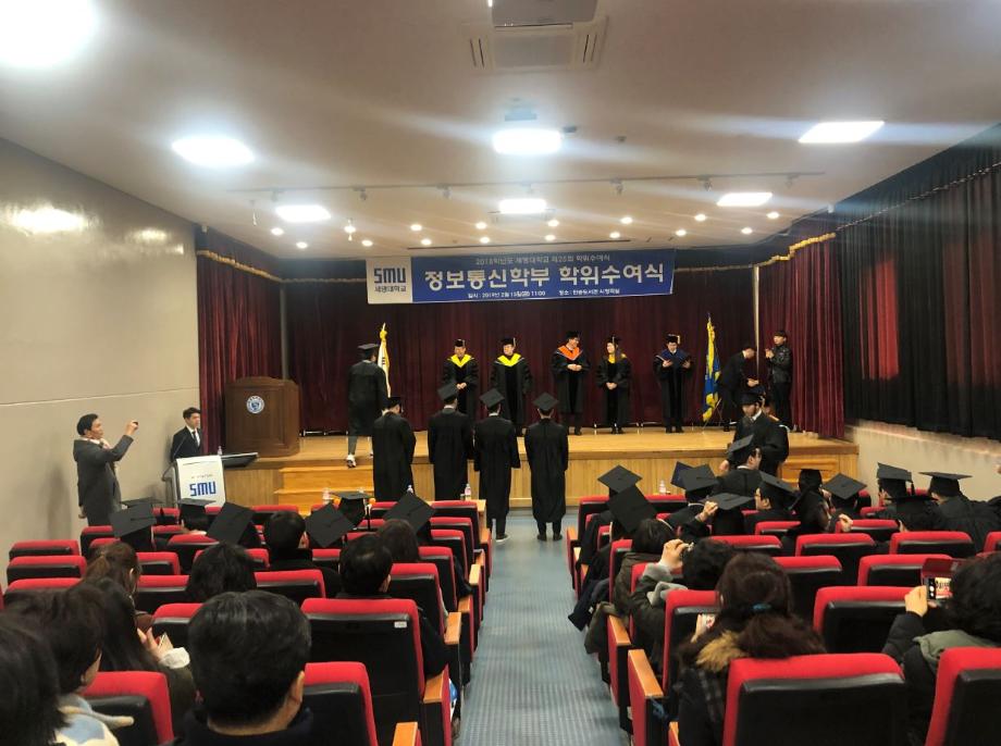 본문 시작 홈으로 SMIT 소식 SMIT 소개 SMIT 교육 SMIT 취업 SMIT 소식 SMIT 입학 홈페이지가이드 갤러리 공지사항 갤러리 경진대회 동아리 갤러리 페이스북 트위터 프린트 2018학년도 전기 학위수여식 정보통신학부 6066 2019-02-20 정보통신학부에서는 02월 15일(금) 민송도서관 시청각실에서 2018학년도 전기 학위수여식을 개최하였다. 정보통신학부에서 총 54명의 졸업생이 학위를 수여받았으며 학부수석 1명, 공로상 2명의 학생들이 상장을 받았다. 이용걸 총장은 축사에서 졸업생에게 “진정한 지성인으로 거듭난 졸업생들이 세상을 밝게 비추는 위세광명의 인재로 활약하게 될 날을 기대한다”며 “졸업생들의 앞날에 무궁한 축복과 발전이 있기를 기원한다”고 전했다. 목록 이전2018학년도 동계방학 중 정보처리기사 자격증 특강 진행 다음 2019학년도 정보통신학부 신입생 '꿈 설계학기' 담당부서 : 스마트IT학부 담당자 : - 연락처 : 043-649-1275 최종수정일 : 2024-10-26 만족도조사 만족도 조사 이 페이지에서 제공하는 정보에 대하여 만족하시나요? 매우만족 만족 보통 불만족 매우불만족