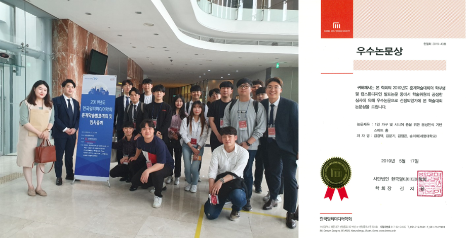 정보통신학부 캡스톤디자인 “또또”팀(김경택, 김문기, 김정은 학생, 지도교수 : 송미화)이 지난 5월 포항공과대학교에서 개최된 ‘2019 한국멀티미디어학회 춘계학술대회’에서 ‘1인 가구 및 시니어 층을 위한 음성인식 기반 스마트 홈’이라는 논문을 발표하여 우수논문상을 받았다. IT 분야 국내 최대 학회인 한국멀티미디어학회는 연 2회 학술대회를 개최하며, 금번 춘계학술대회에는 영상, 신호처리, AR/VR, IoT, 컴퓨터비전/기계학습, 정보보호, 콘텐츠 응용, 빅데이터 시스템/분석, 게임/애니메이션의 분야에서 400여 편의 연구논문이 구두 및 포스터로 나뉘어 발표되었다. 정보통신학부는 캡스톤디자인 작품의 우수성을 홍보하기 위하여 담당교수가 추천한 7개 팀이 춘계학술대회에 연구결과를 발표하였다. 참여 학생들은 정보통신 캡스톤디자인 I, II 과정을 통해 1년 동안 창의적인 작품을 기획, 연구, 개발한 결과를 교외 학술대회에 발표함으로써 전공역량 및 발표역량을 기르는 기회가 되었고, 또한 연구의 학술적 가치를 인정받아 우수논문상을 수상하여 대외적으로 세명대학교 정보통신학부의 이미지를 높일 수 있는 계기가 되었다.