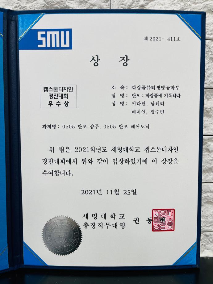 본문 시작 홈으로 커뮤니티 학과소개 학과과정 대학원 커뮤니티 연구동아리 홈페이지가이드 포토갤러리 학과공지 채용정보 학과일정 포토갤러리 유튜브 인스타그램 취업현황 학생회 조직도 졸업생 숏터뷰 포토갤러리 페이스북 트위터 프린트 2021학년도 캡스톤디자인 경진대회 입상_단오 팀 화장품뷰티학부 3664 2021-12-20 2021학년도 세명대학교 캡스톤디자인 경진대회에서 우리 화장품학부 '단오' 팀에서 우수상을 받았습니다. 입상 축하드립니다 :) 목록 이전2021 대학혁신지원사업 연구역량 강화 프로그램 포스터 게시 다음 세명대학교 화장품뷰티학부 2022학년도 정시모집 안내 담당부서 : 바이오코스메틱학과 담당자 : - 연락처 : 043-649-1638 최종수정일 : 2024-10-26 만족도조사 만족도 조사 이 페이지에서 제공하는 정보에 대하여 만족하시나요? 매우만족 만족 보통 불만족 매우불만족