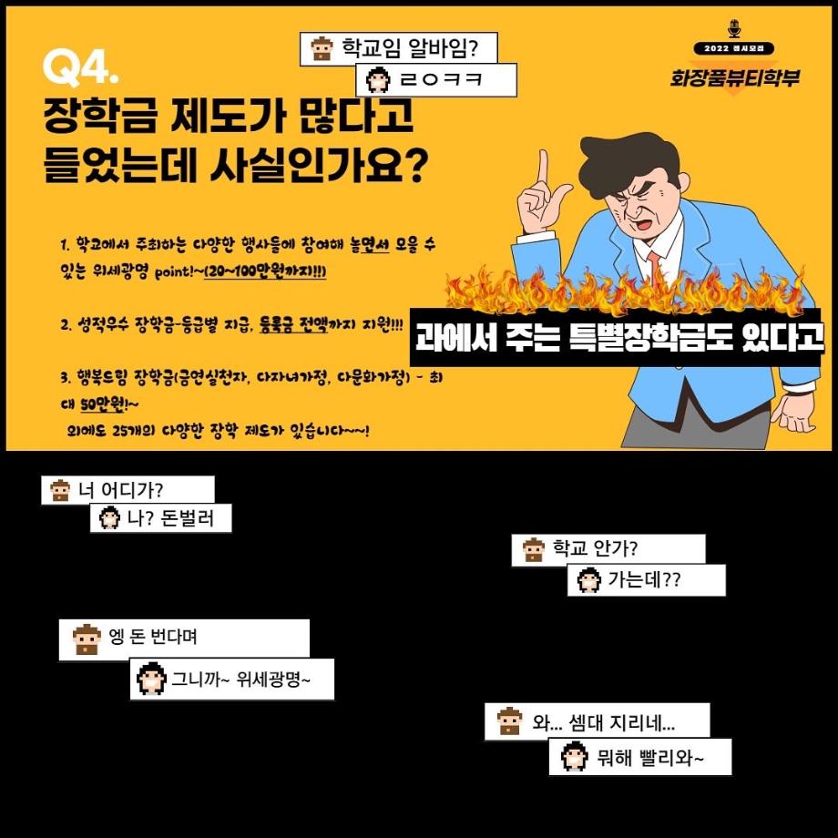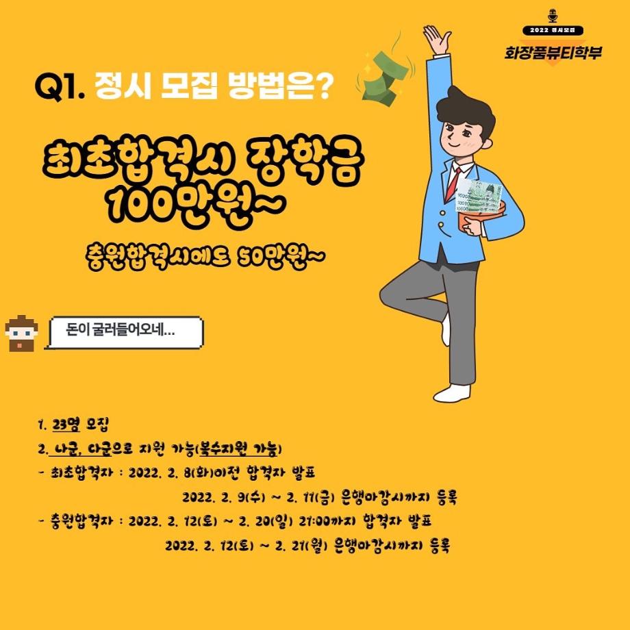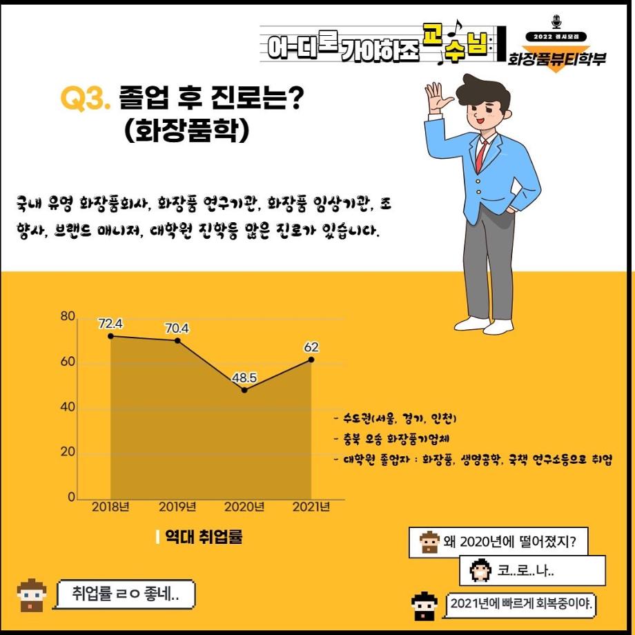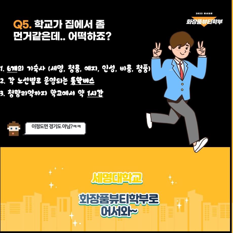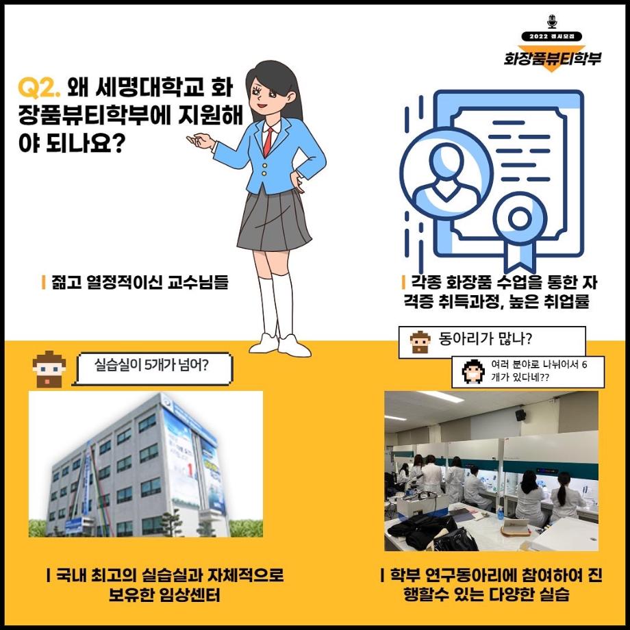 본문 시작 홈으로 커뮤니티 학과소개 학과과정 대학원 커뮤니티 연구동아리 홈페이지가이드 포토갤러리 학과공지 채용정보 학과일정 포토갤러리 유튜브 인스타그램 취업현황 학생회 조직도 졸업생 숏터뷰 포토갤러리 페이스북 트위터 프린트 세명대학교 화장품뷰티학부 2022학년도 정시모집 안내 화장품뷰티학부 3323 2022-01-13 그곳이 알고싶다! 세명대학교 화장품뷰티학부를 소개합니다~ 목록 이전2021학년도 캡스톤디자인 경진대회 입상_단오 팀 다음 2021학년도 화장품뷰티학부 공유대학 혁신인재장학금 장학생 명단 담당부서 : 바이오코스메틱학과 담당자 : - 연락처 : 043-649-1638 최종수정일 : 2024-10-26 만족도조사 만족도 조사 이 페이지에서 제공하는 정보에 대하여 만족하시나요? 매우만족 만족 보통 불만족 매우불만족