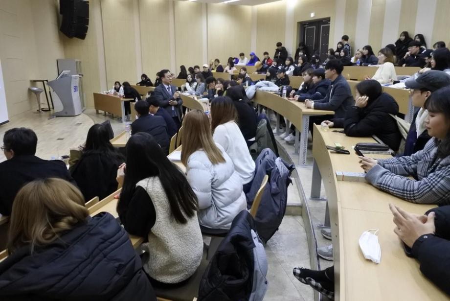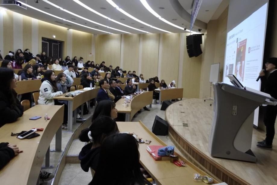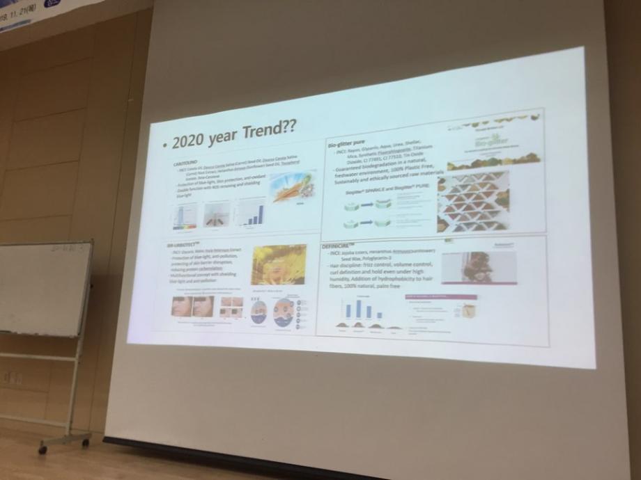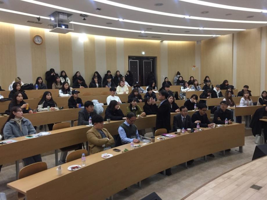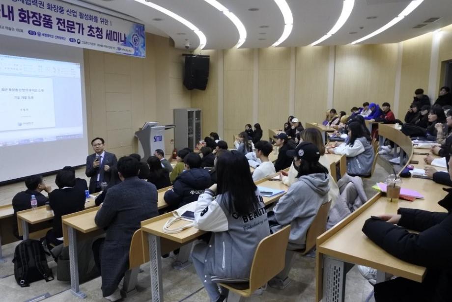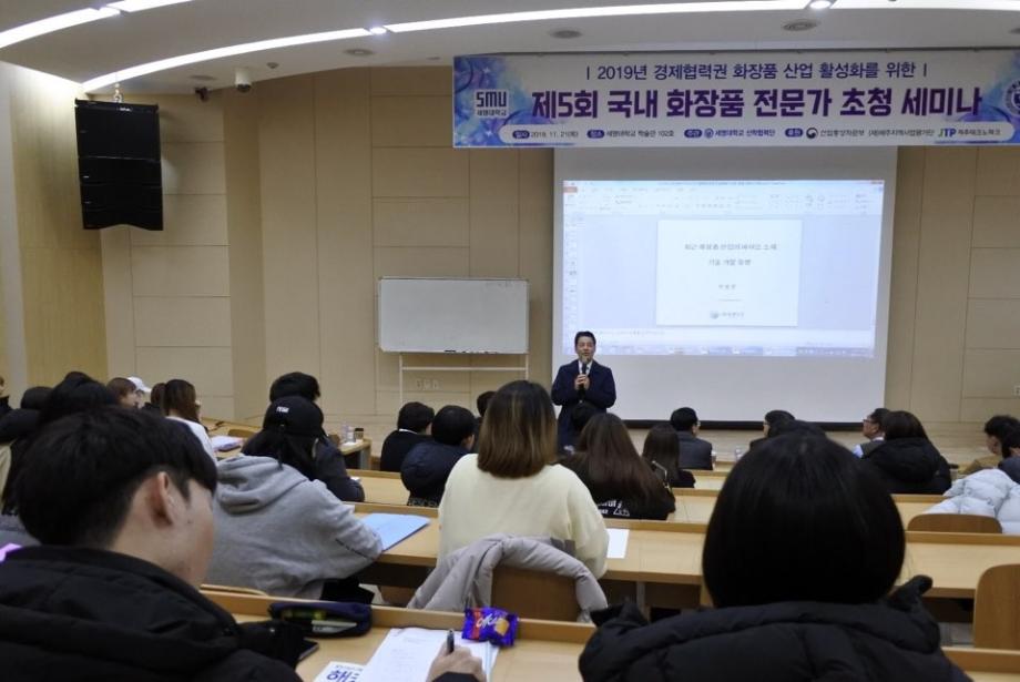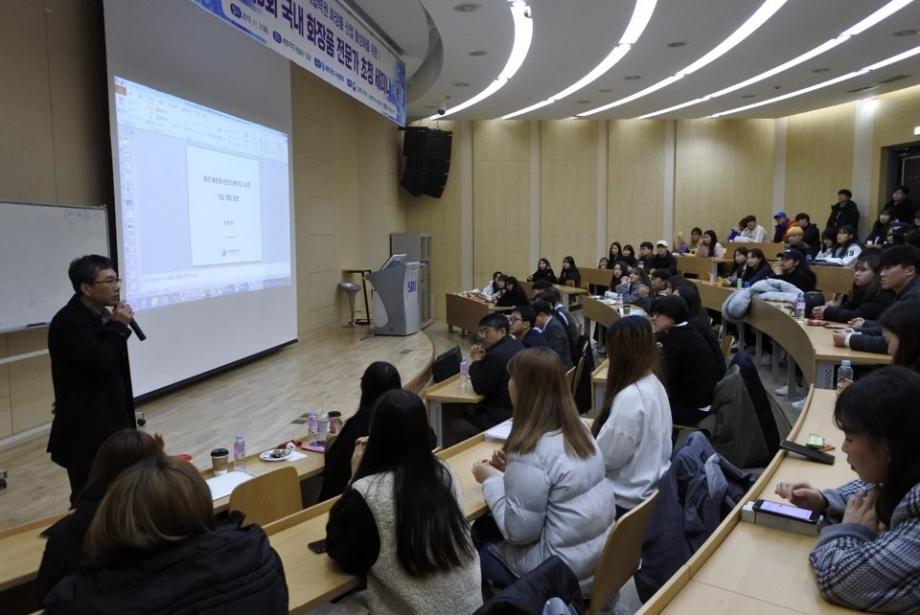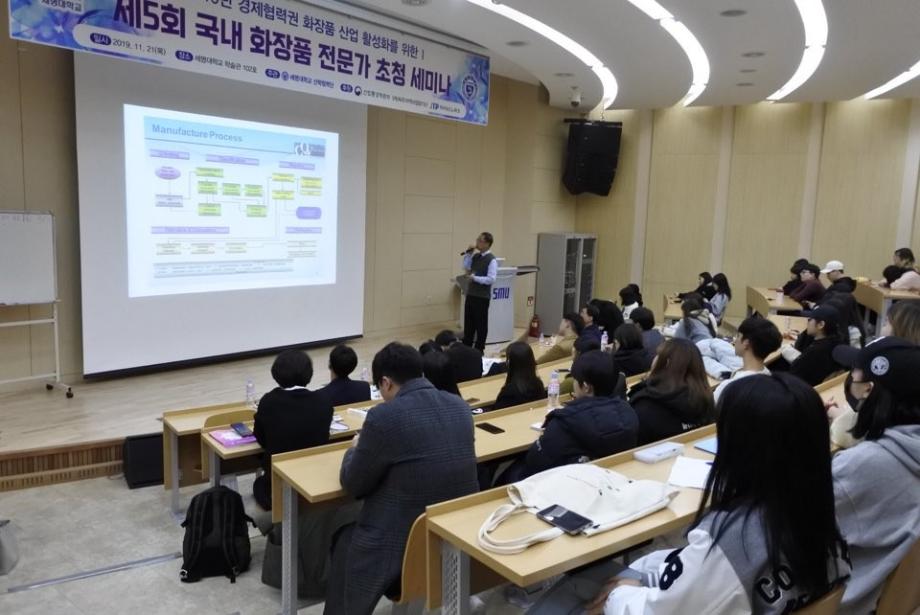 경제협력권 화장품 산업 활성화를 위한 제5회 국내 화장품 전문가 초청 세미나가 11.21(목) 학술관 102호에서 개최되었습니다. 이날 외부 연자로는 토니모리 (메가코스) 김영호 연구소장, 휴앤스킨 이범천 연구소장, 심비오즈코스메틱(록시땅) 정진희 책임연구원, 씨큐브 김상훈 부장님이 참석하셔서 2020년 화장품 트렌드와 기술 동향, 그리고 글로벌 소재 개발 전략, 록시땅 Eborian 브랜드, 진주안료 소재 활용등에 대해 유익한 말씀을 많이 주셨습니다. 이를 통해 화장품 전공 학생들은 화장품 산업에 대한 동향과 화장품 관련 지식을 전달받고 이해하는 유익한 시간을 가졌습니다.