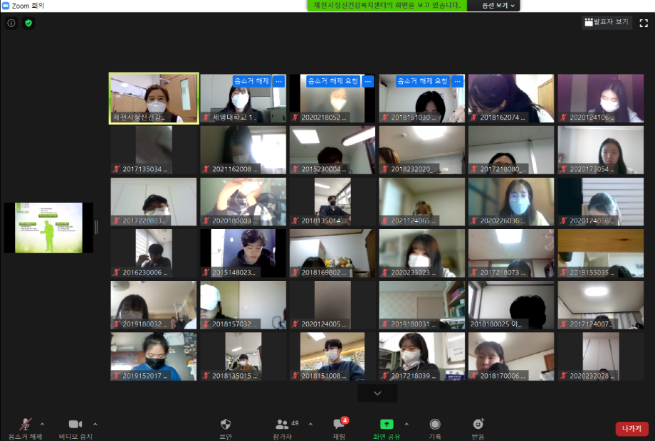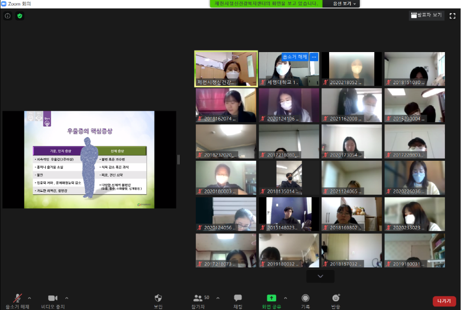 본문 시작 2021학년도 건강상담의 날 "자살예방교육" 실시 CHARM케어센터 3872 2021-04-23 <건강상담의 날 "자살예방교육" 실시> 일시 : 4/14(수) 14:00~15:30 강사 : 제천시정신건강복지센터 팀장 신효진 목록 이전2020학년도 CTI진로사고검사 재결정프로그램 "탄탄대로" (1차) 다음 2021학년도 인권서포터즈 'SMile' 발대식 담당부서 : CHARM케어상담센터 담당자 : - 연락처 : 043-649-1789 최종수정일 : 2024-10-26 만족도조사 만족도 조사 이 페이지에서 제공하는 정보에 대하여 만족하시나요? 매우만족 만족 보통 불만족 매우불만족