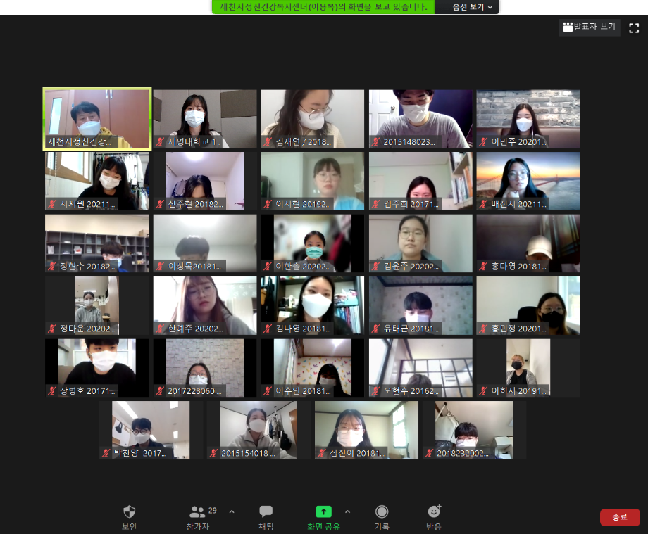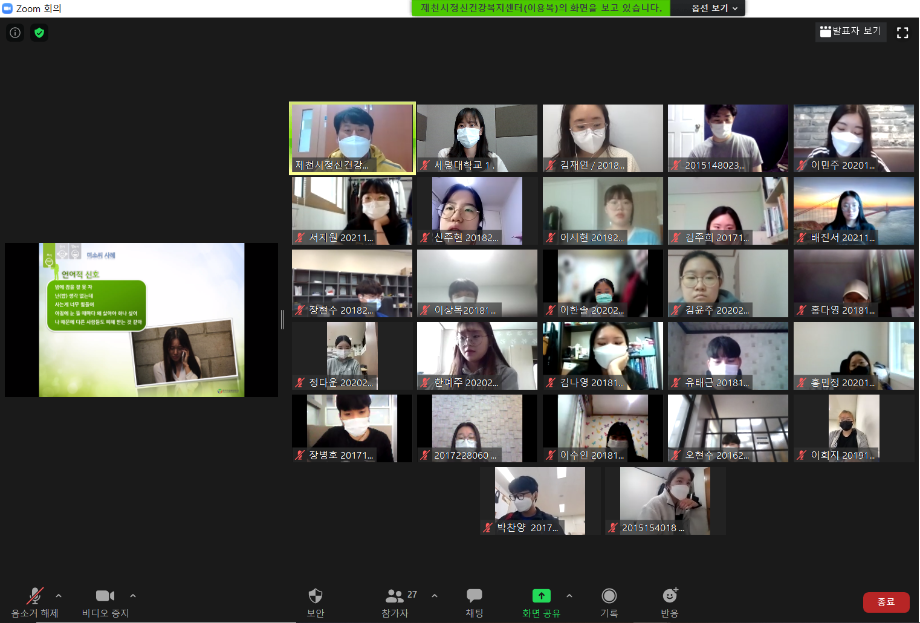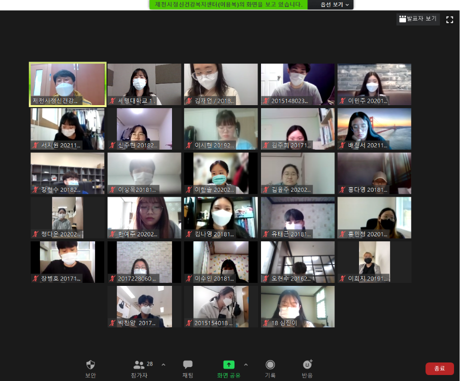 본문 시작 2021학년도 건강상담의 날 프로그램 "자살예방교육" (05.25) 실시 CHARM케어상담센터 3590 2021-05-25 <건강상담의 날 "자살예방교육" 실시> 일시 : 5/25(화) 14:00~15:30 강사 : 제천시정신건강복지센터 사회복지사 김용복 목록 이전2021학년도 인권서포터즈 'SMile' 발대식 다음 폭력예방 캠페인_가정폭력상담소와함께 담당부서 : CHARM케어상담센터 담당자 : - 연락처 : 043-649-1789 최종수정일 : 2024-10-26 만족도조사 만족도 조사 이 페이지에서 제공하는 정보에 대하여 만족하시나요? 매우만족 만족 보통 불만족 매우불만족