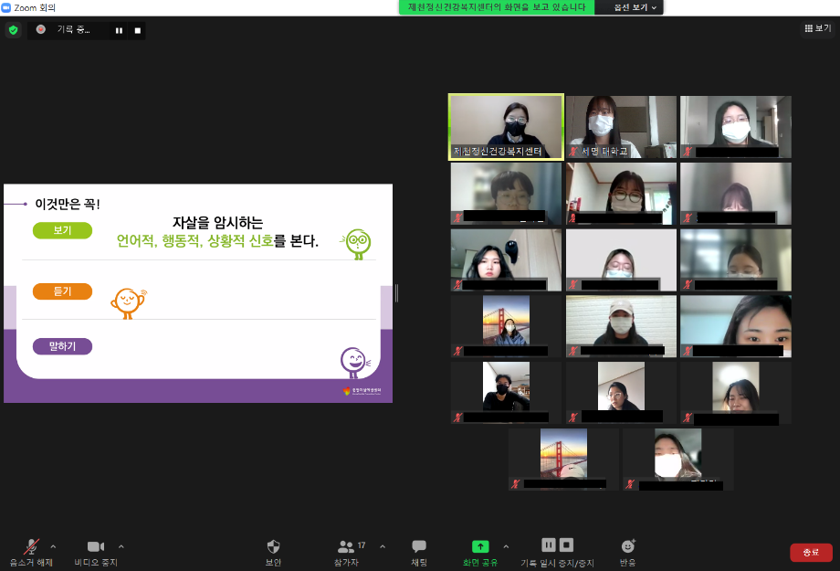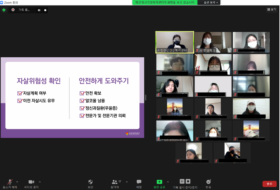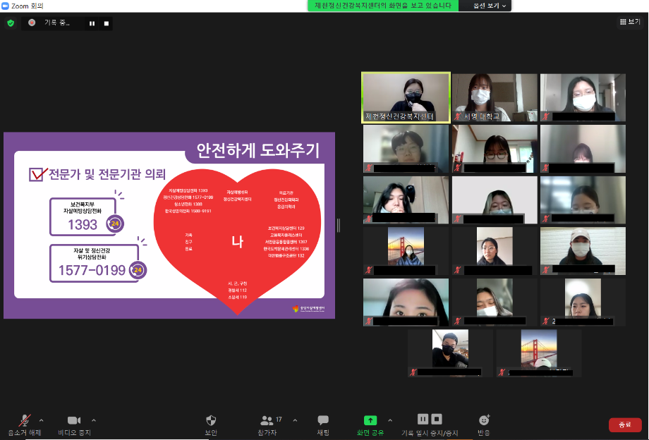 본문 시작 2021학년도 건강상담의 날 "자살예방교육"(11.23) CHARM케어상담센터 3436 2021-11-23 2021학년도 2학기 두번째 건강상담의 날 "자살예방교육"(2021.11.23) 목록 이전2021학년도 2학기 코로나-19 마음치료 힐링프로그램(편입생,복학생,유학생) 이전9월 불법카메라 정기점검 진행 담당부서 : CHARM케어상담센터 담당자 : - 연락처 : 043-649-1789 최종수정일 : 2024-10-26 만족도조사 만족도 조사 이 페이지에서 제공하는 정보에 대하여 만족하시나요? 매우만족 만족 보통 불만족 매우불만족