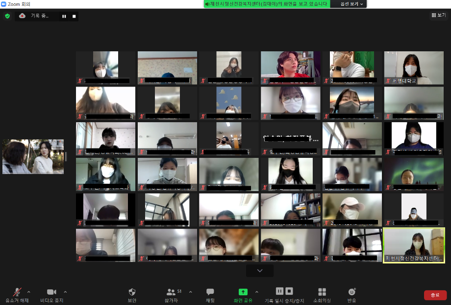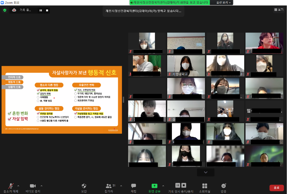 본문 시작 2022학년도 건강상담의 날 "자살예방교육"(03.24) CHARM케어상담센터 4053 2022-03-25 2022학년도 1학기 첫번째 건강상담의 날 "자살예방교육"(2022.03.24) 목록 이전12월 불법카메라 정기점검 진행 다음 2022학년도 1학기 청년 대상 "방방곡곡" 마음안심버스 운영 담당부서 : CHARM케어상담센터 담당자 : - 연락처 : 043-649-1789 최종수정일 : 2024-10-26 만족도조사 만족도 조사 이 페이지에서 제공하는 정보에 대하여 만족하시나요? 매우만족 만족 보통 불만족 매우불만족