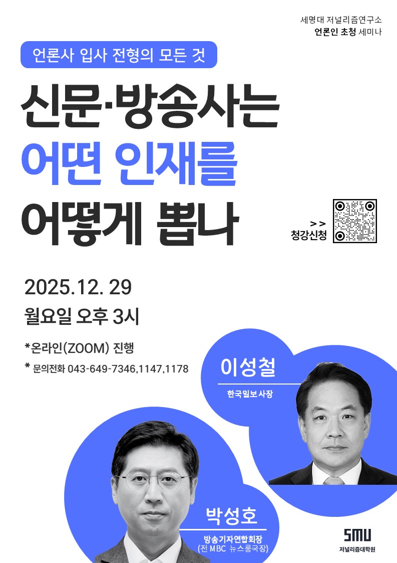 세명대 저널리즘연구소는 오는 12월 29일(월) 오후 3시 온라인 줌(Zoom)을 통해