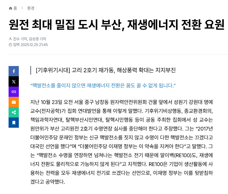 지난 10월 23일 오전 서울 중구 남창동 원자력안전위원회 건물 앞에서 성원기 강원대 명예교수(전자공학)가 집회 연대발언을 통해 이렇게 말했다. 기후위기비상행동, 종교환경회의, 책임과학자연대, 탈핵부산시민연대, 탈핵시민행동 등이 공동 주최한 집회에서 성 교수는 원안위가 부산 고리원전 2호기 수명연장 심사를 중단해야 한다고 주장했다. 그는 “2017년 더불어민주당 문재인 정부는 신규 핵발전소를 짓지 않고 수명이 다한 핵발전소는 끄겠다고 대국민 선언을 했다”며 “더불어민주당 이재명 정부는 이 약속을 지켜야 한다”고 말했다. 그는 “핵발전소 수명을 연장하면 넘쳐나는 핵발전소 전기 때문에 알이백(RE100)도, 재생에너지 전환도 물리적으로 가능하지 않게 된다”고 지적했다. RE100은 기업이 생산활동에 사용하는 전력을 모두 재생에너지 전기로 쓰겠다는 선언으로, 이재명 정부는 이를 뒷받침하겠다고 공약했다.
