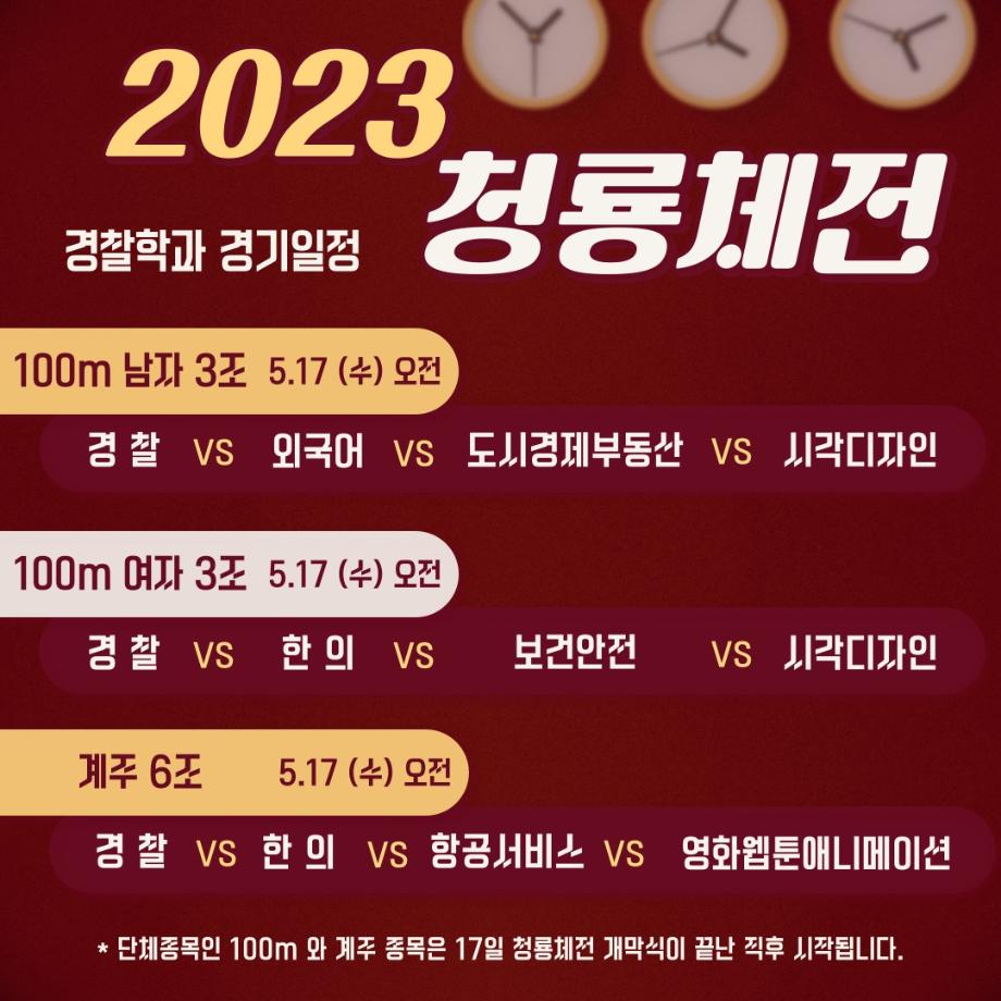 본문 시작 홈으로 커뮤니티 학과소개 교수소개 학과과정 커뮤니티 홈페이지가이드 포토갤러리 학부공지 학과일정 포토갤러리 학생회 동아리 포토갤러리 페이스북 트위터 프린트 2023 청룡체전 안내 경찰학과 3947 2023-05-14 5월 17일부터 19일은 청룡체전 기간입니다 ! 4년만에 대면으로 이루어지는 청룡체전인만큼 경기에 출전하는 체전선수들에게 많은 관심과 응원 부탁드립니다! 목록 이전2023년 4월 사진공보전 이벤트 당첨자 발표 다음 2023년 5월 사진공모전 이벤트 안내 만족도조사 만족도 조사 이 페이지에서 제공하는 정보에 대하여 만족하시나요? 매우만족 만족 보통 불만족 매우불만족