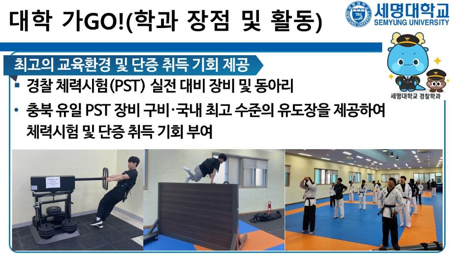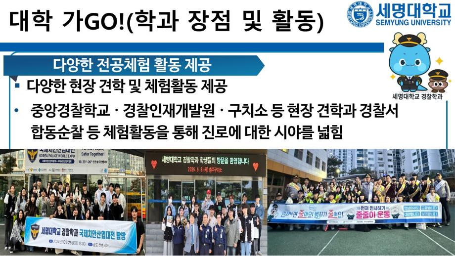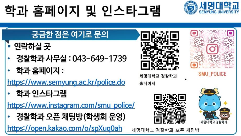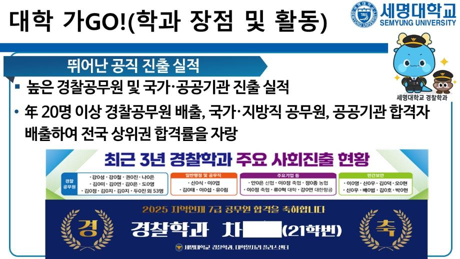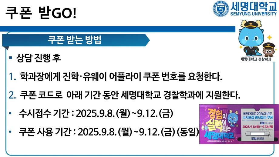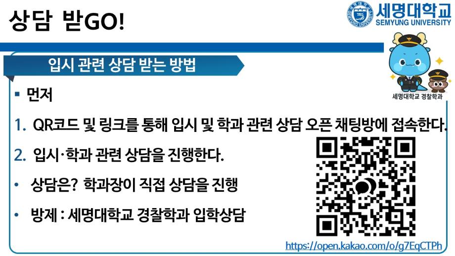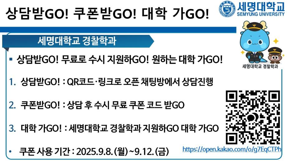 본문 시작 홈으로 커뮤니티 학과소개 교수소개 학과과정 커뮤니티 홈페이지가이드 포토갤러리 학부공지 학과일정 포토갤러리 학생회 동아리 포토갤러리 페이스북 트위터 프린트 상담받고GO! 쿠폰받GO! 무료로 대학 지원하GO! 경찰학과 2092 2025-09-05 세명대학교 경찰학과 2026학년도 수시 지원 상담받GO! 쿠폰 받GO! 무료로 대학 지원하GO! 상담받GO! : 먼저 QR코드·링크로 오픈 채팅방에서 상담받GO 쿠폰받GO! : 상담 후 수시 무료 쿠폰 코드 받GO 무료로 대학지원하GO! : 세명대학교 경찰학과 지원하GO 사용처 : 진학어플라이, 유웨이어플라이 쿠폰 사용 기간 : 2025.9.8.(월)~9.12.(금) 세명대학교 경찰학과 2026학년도 수시 모집에 많은 관심 부탁드립니다. 목록 이전2025학년도 하계 방학 중 본교 편의시설 운영 안내 다음 해외 취업사기 범죄예방교육 만족도조사 만족도 조사 이 페이지에서 제공하는 정보에 대하여 만족하시나요? 매우만족 만족 보통 불만족 매우불만족