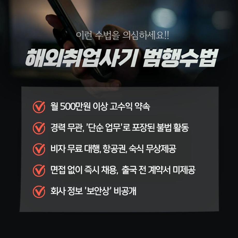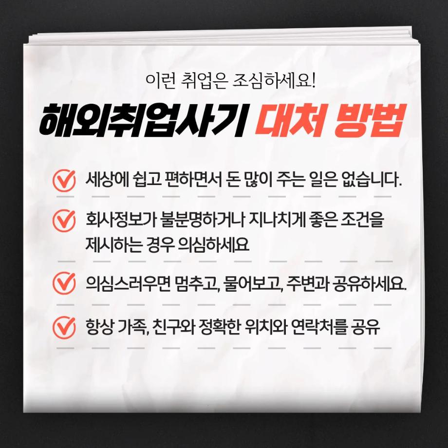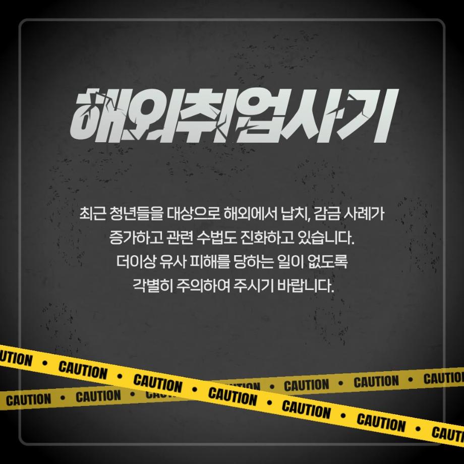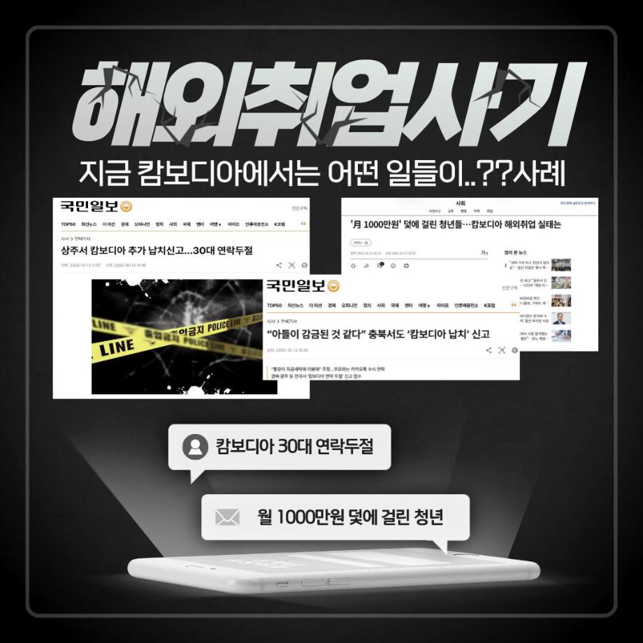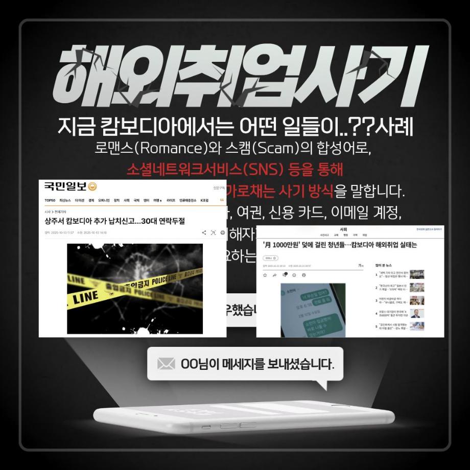 본문 시작 홈으로 커뮤니티 학과소개 교수소개 학과과정 커뮤니티 홈페이지가이드 포토갤러리 학부공지 학과일정 포토갤러리 학생회 동아리 포토갤러리 페이스북 트위터 프린트 해외 취업사기 범죄예방교육 경찰학과 1955 2025-10-20 안녕하세요 세명대학교 경찰학과 입니다. 최근 이슈가 되고있는 해외취업사기 관련카드뉴스 입니다. 목록 이전상담받고GO! 쿠폰받GO! 무료로 대학 지원하GO! 다음 [제천제일고등학교] 진로체험 프로그램 만족도조사 만족도 조사 이 페이지에서 제공하는 정보에 대하여 만족하시나요? 매우만족 만족 보통 불만족 매우불만족