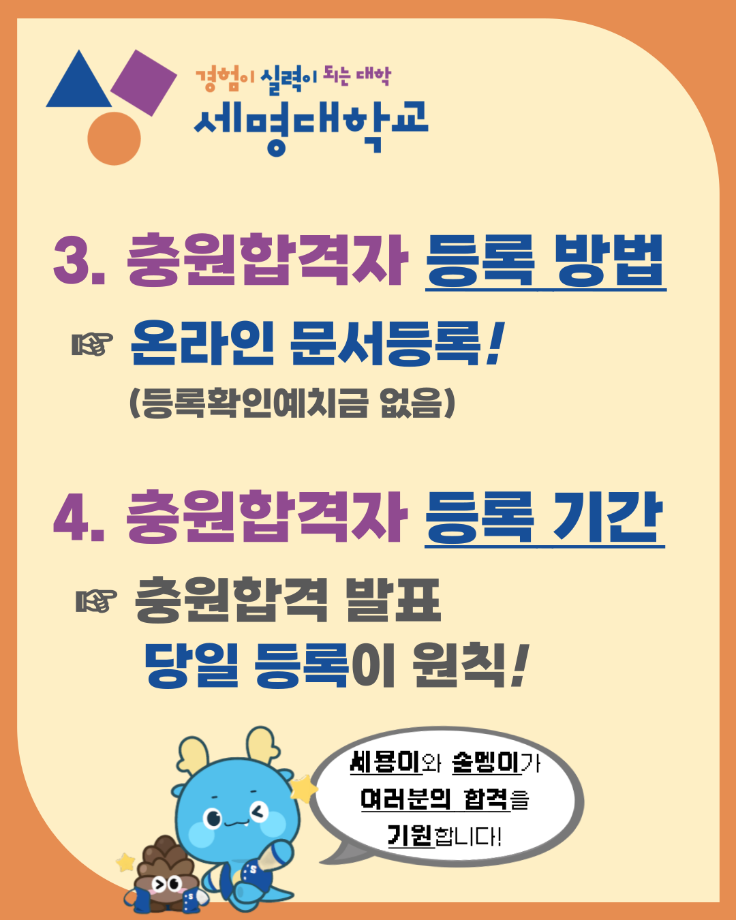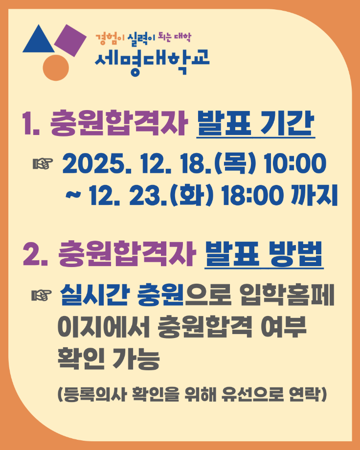 본문 시작 홈으로 학과생활 학과소개 교수소개 교과과정 학과생활 홈페이지가이드 사진게시판 공지사항 사진게시판 전공자료실 동아리 학과행사 사진게시판 페이스북 트위터 프린트 [수시모집] 2026학년도 수시모집 충원합격자 발표안내 산업디자인학과 151 2025-12-18 목록 이전[수시모집] 2026학년도 수시모집 최초합격자 등록안내 다음 [정시모집] 2026 세명대학교 정시모집 전형방법 담당부서 : 산업디자인학과 담당자 : - 연락처 : 043-649-1436 최종수정일 : 2024-10-26 만족도조사 만족도 조사 이 페이지에서 제공하는 정보에 대하여 만족하시나요? 매우만족 만족 보통 불만족 매우불만족