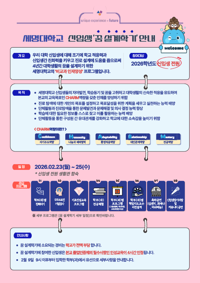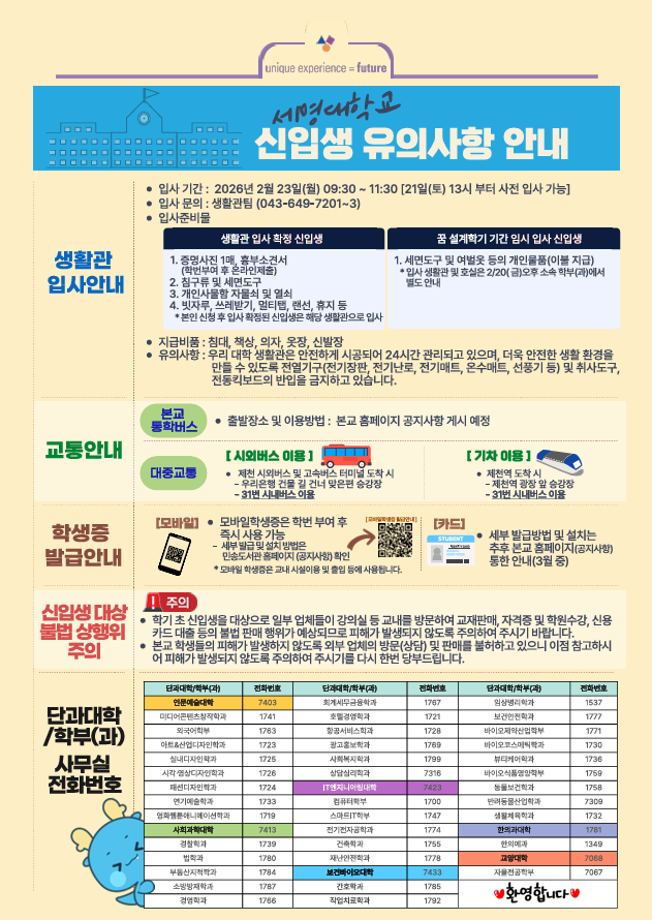 본문 시작 홈으로 학과생활 학과소개 교수소개 교과과정 학과생활 홈페이지가이드 사진게시판 공지사항 사진게시판 전공자료실 동아리 학과행사 사진게시판 페이스북 트위터 프린트 [학생처] 2026학년도 신입생 '꿈 설계학기(오리엔테이션)' 시행 산업디자인학과 31 2026-02-04 목록 이전다이소 세명대점 오픈(2/19) 안내 담당부서 : 산업디자인학과 담당자 : - 연락처 : 043-649-1436 최종수정일 : 2024-10-26 만족도조사 만족도 조사 이 페이지에서 제공하는 정보에 대하여 만족하시나요? 매우만족 만족 보통 불만족 매우불만족