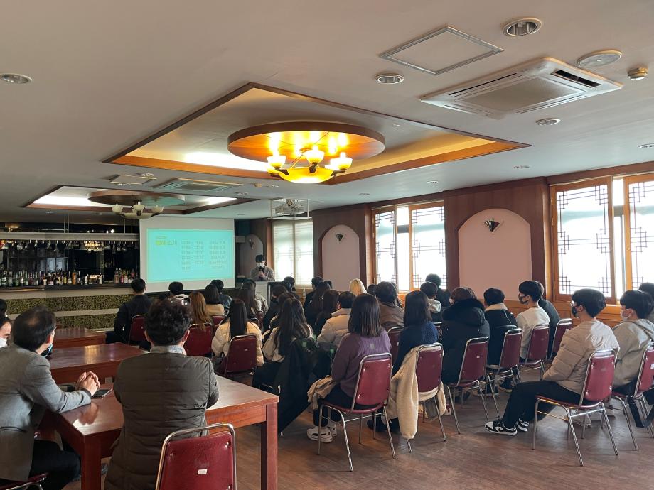 - 현재 COVID-19 사태가 지속되어 학교 적응 및 학과에 대한 소속감을 키우고 동시에 각 지도교수님과의 대면상담을 통하여 교수님과의 관계형성에도 도움을 주고자 교수님 및 학과 학생회분들이 좋은 자리를 마련함.