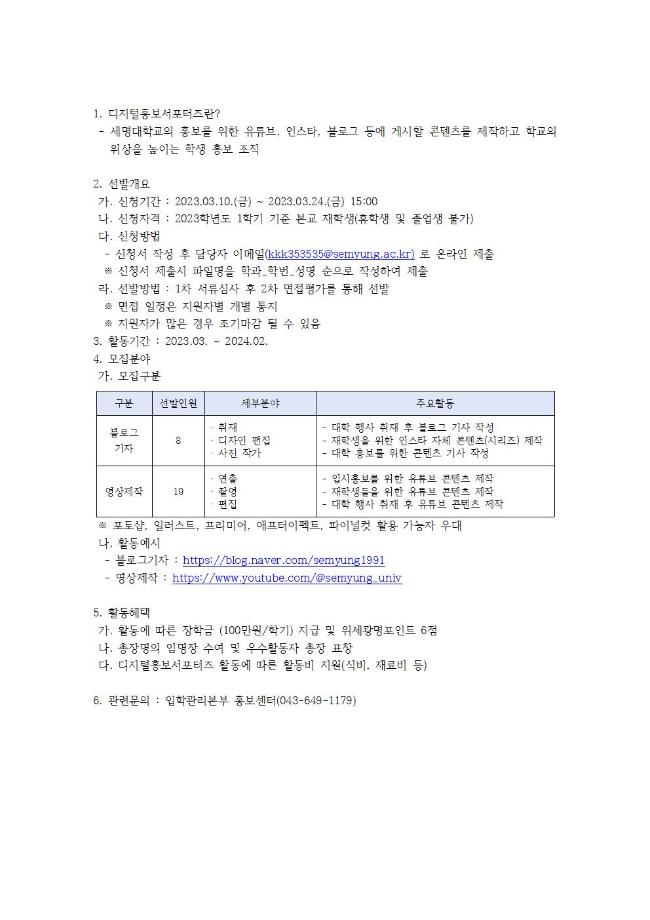 본문 시작 홈으로 커뮤니티 학과소개 입학정보 교수소개 학과과정 커뮤니티 공연예매 안내 홈페이지가이드 포토갤러리 공지사항 포토갤러리 작품DB 동아리 학사일정 학생회 포토갤러리 페이스북 트위터 프린트 2023학년도 세명대학교 디지털 홍보 서포터즈 연기예술학과 2661 2023-03-14 2023학년도 세명대학교 디지털 홍보 서포터즈 목록 이전2023학년도 1학기 개강총회 안내문 다음 2023학년도 학생위원회 신규위원 모집 담당부서 : 연기예술학과 담당자 : - 연락처 : 043-649-1733 최종수정일 : 2024-10-26 만족도조사 만족도 조사 이 페이지에서 제공하는 정보에 대하여 만족하시나요? 매우만족 만족 보통 불만족 매우불만족