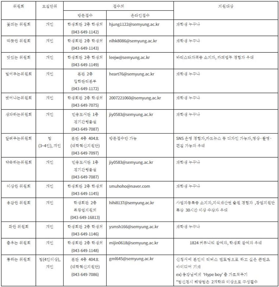 본문 시작 홈으로 커뮤니티 학과소개 입학정보 교수소개 학과과정 커뮤니티 공연예매 안내 홈페이지가이드 포토갤러리 공지사항 포토갤러리 작품DB 동아리 학사일정 학생회 포토갤러리 페이스북 트위터 프린트 2023학년도 학생위원회 신규위원 모집 연기예술학과 2685 2023-03-15 2023학년도 학생위원회 신규위원 모집 목록 이전2023학년도 세명대학교 디지털 홍보 서포터즈 다음 2023학년도 대학생 청소년교육지원사업 장학생 모집 안내 담당부서 : 연기예술학과 담당자 : - 연락처 : 043-649-1733 최종수정일 : 2024-10-26 만족도조사 만족도 조사 이 페이지에서 제공하는 정보에 대하여 만족하시나요? 매우만족 만족 보통 불만족 매우불만족