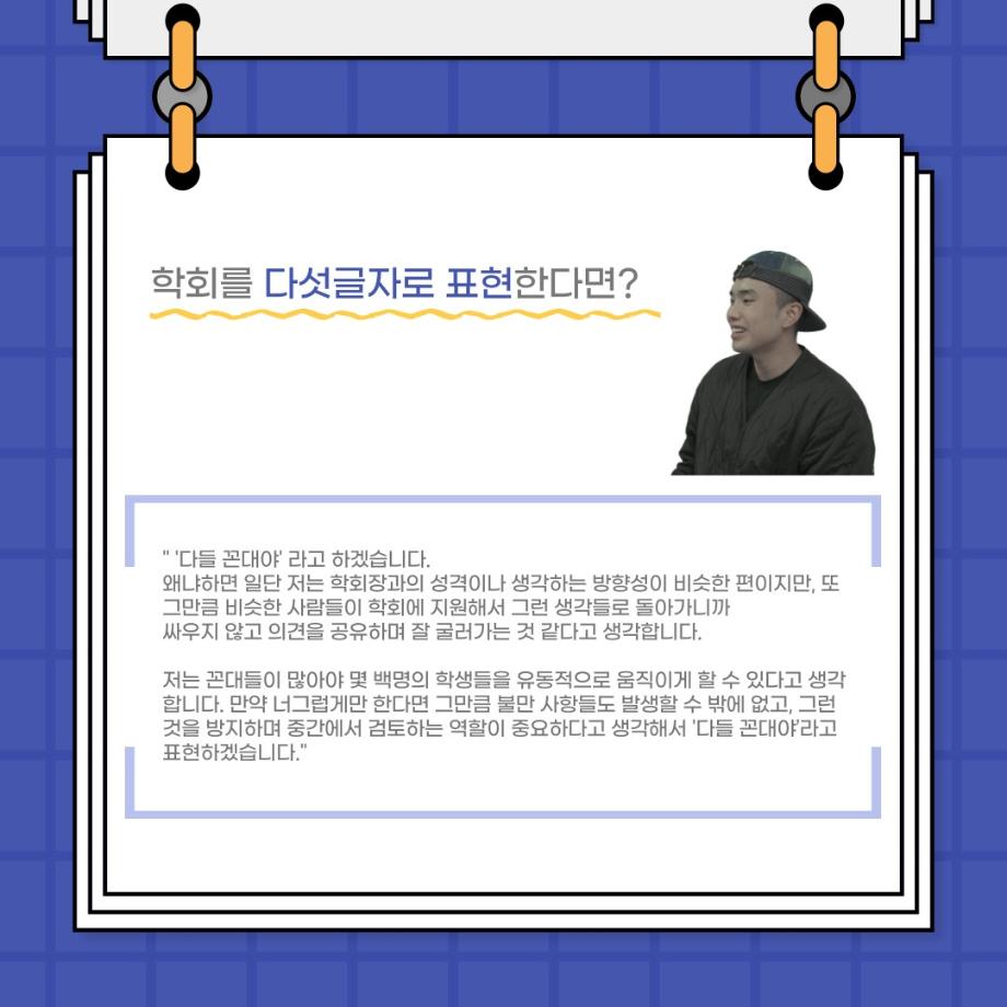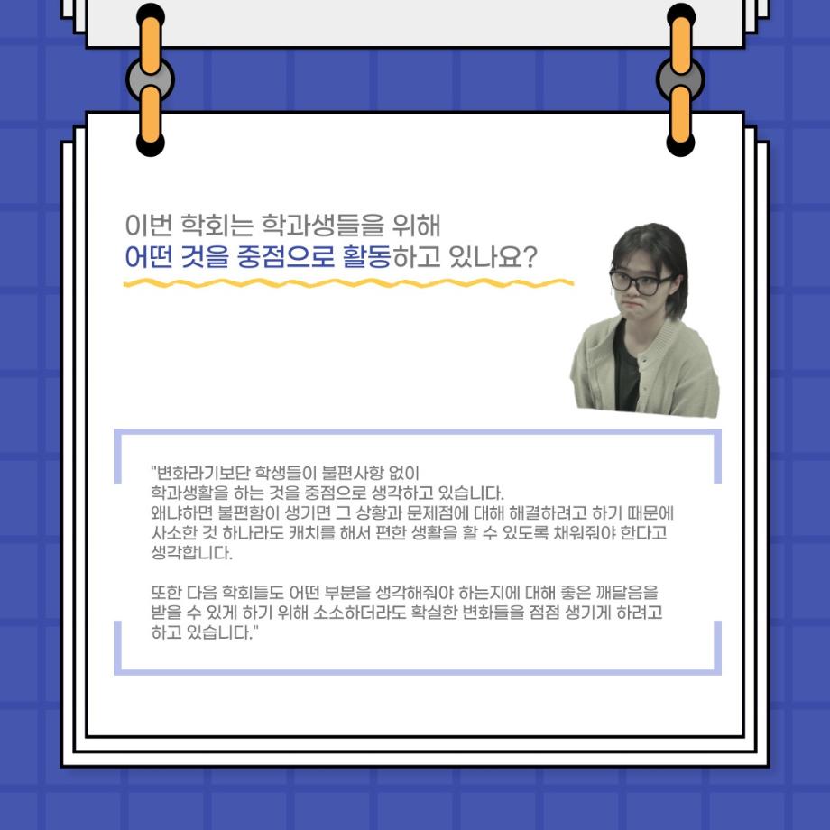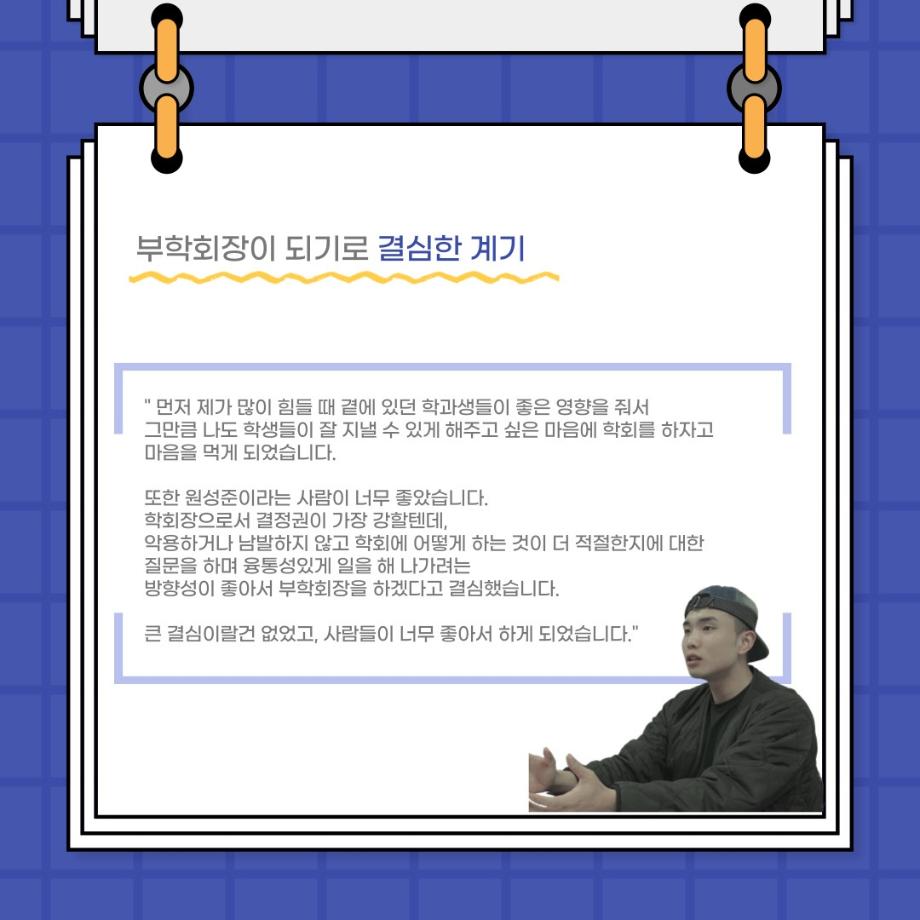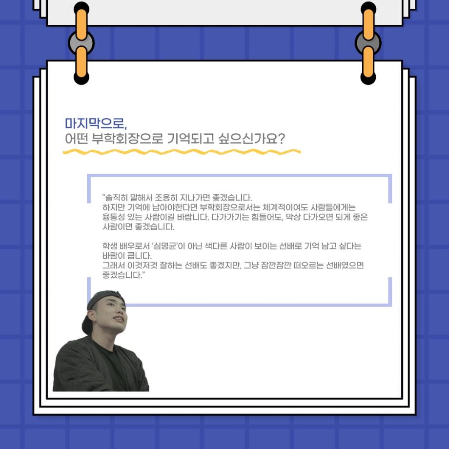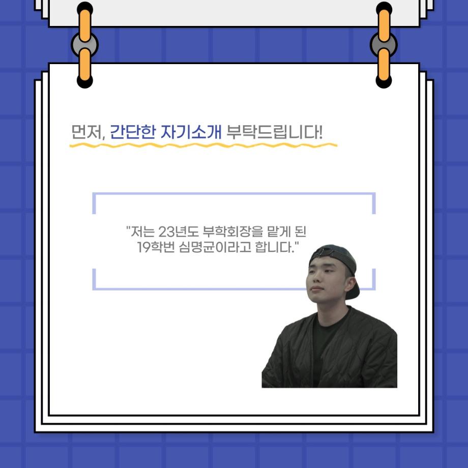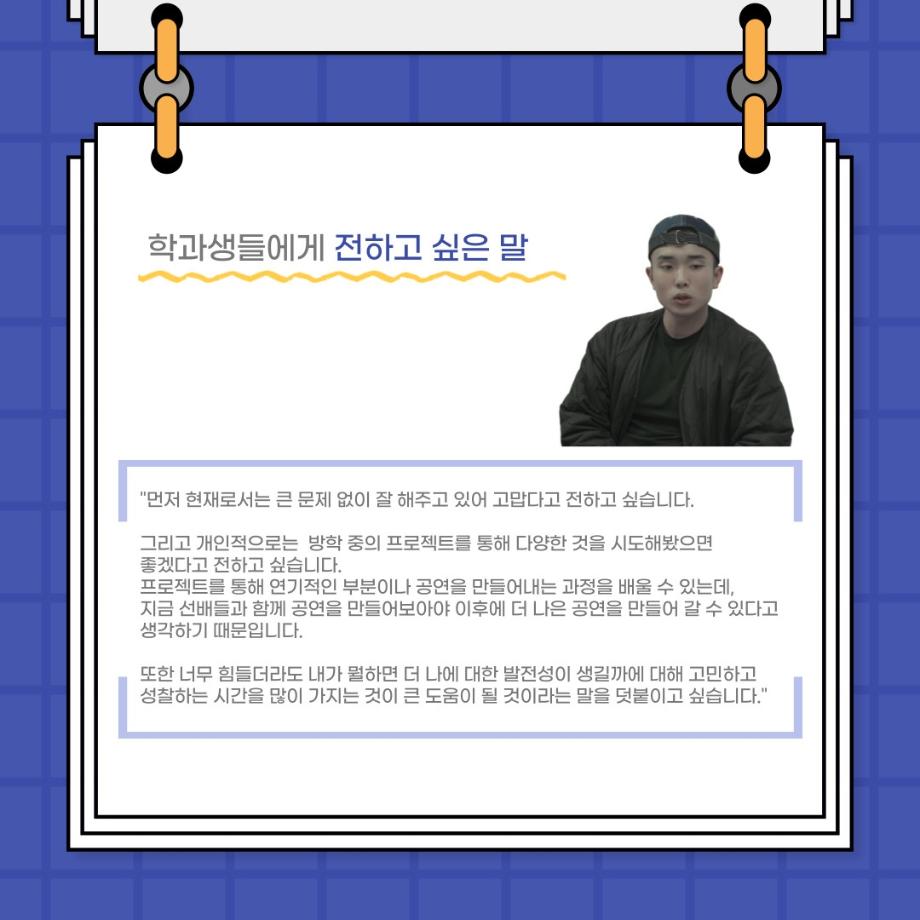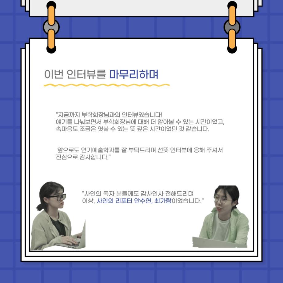 본문 시작 홈으로 커뮤니티 학과소개 입학정보 교수소개 학과과정 커뮤니티 공연예매 안내 홈페이지가이드 포토갤러리 공지사항 포토갤러리 작품DB 동아리 학사일정 학생회 포토갤러리 페이스북 트위터 프린트 사이와의 인터뷰 - 23년도 부학회장 ‘심명균’ 연기예술학과 3330 2023-06-07 안녕하십니까. 23년도 학회 ‘사이’입니다! 학회 ‘사이’의 두번째 인터뷰로 연기예술학과 23년도 부학회장인 심명균 부학회장과 인터뷰하는 시간을 가졌습니다. 학회를 맡은 소감과 부학회장이 되기로 결심한 계기, 학과생들에게 전하고 싶은 말 등 다양한 인터뷰를 진행하였습니다. 다음 인터뷰 컨텐츠 ‘사인’도 많은 사랑 부탁드립니다. 목록 다음 제 97회 세명대학교 연기예술학과 정기공연 '하계 프로젝트' < 첼로와 케찹 > 캐릭터 포스터 다음 사이와의 인터뷰 - 23년도 무대사수 ‘이종화’ 담당부서 : 연기예술학과 담당자 : - 연락처 : 043-649-1733 최종수정일 : 2024-10-26 만족도조사 만족도 조사 이 페이지에서 제공하는 정보에 대하여 만족하시나요? 매우만족 만족 보통 불만족 매우불만족