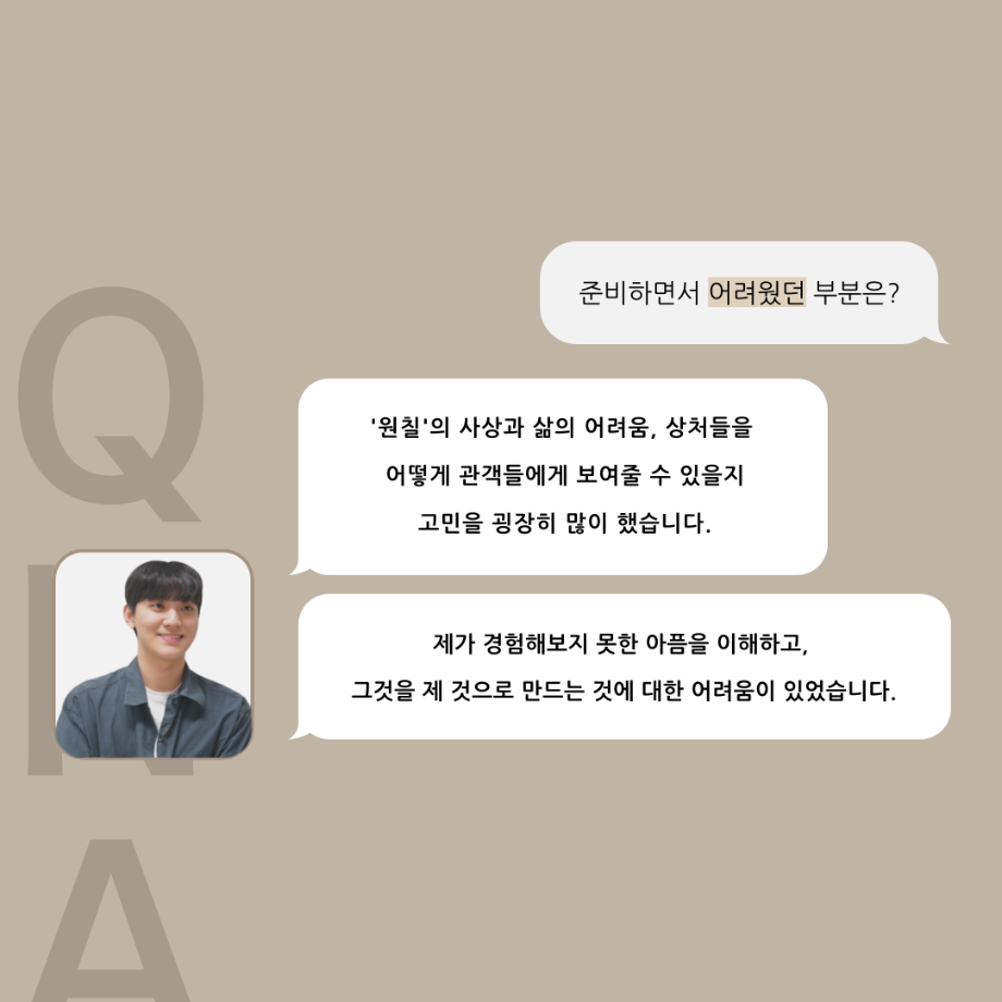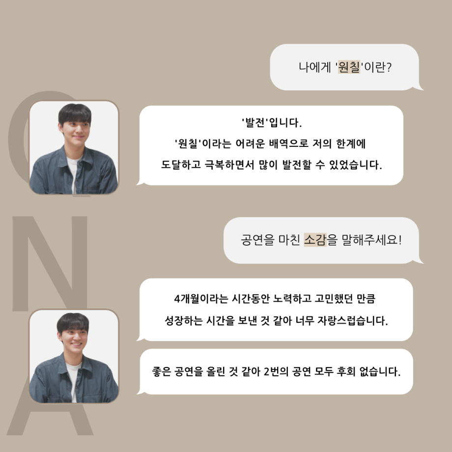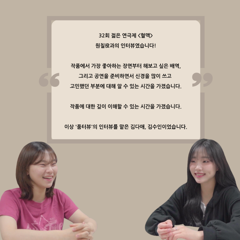 본문 시작 홈으로 커뮤니티 학과소개 입학정보 교수소개 학과과정 커뮤니티 공연예매 안내 홈페이지가이드 포토갤러리 공지사항 포토갤러리 작품DB 동아리 학사일정 학생회 포토갤러리 페이스북 트위터 프린트 '품'위있는 인'터뷰' - 24년도 젊은연극제 원칠役 <김은혁> 연기예술학과 3420 2024-08-13 안녕하십니까. 24년도 학회 ‘품’ 입니다. 학회 ‘품’의 열 두 번째 인터뷰로 세명대학교 연기예술학과 24학년도 젊은연극제 참가작 <혈맥> 원칠 역인 김은혁 학우와 인터뷰 하는 시간을 가졌습니다. 가장 좋아하는 장면, 자신의 배역을 제외하고 해보고 싶은 배역 그리고 준비하면서 어려웠던 부분과 공연을 마친 소감 등에 대해 인터뷰 하는 시간을 가졌습니다. 앞으로 있을 인터뷰 컨텐츠인 ‘품터뷰’ 많은 사랑 부탁드립니다. 목록 이전제6회 세명진로 Festival 대면 특강 안내 다음 연기예술학과 108회 정기공연 하계 프로젝트 <도덕적 도둑> 프로필 스틸컷 담당부서 : 연기예술학과 담당자 : - 연락처 : 043-649-1733 최종수정일 : 2024-10-26 만족도조사 만족도 조사 이 페이지에서 제공하는 정보에 대하여 만족하시나요? 매우만족 만족 보통 불만족 매우불만족