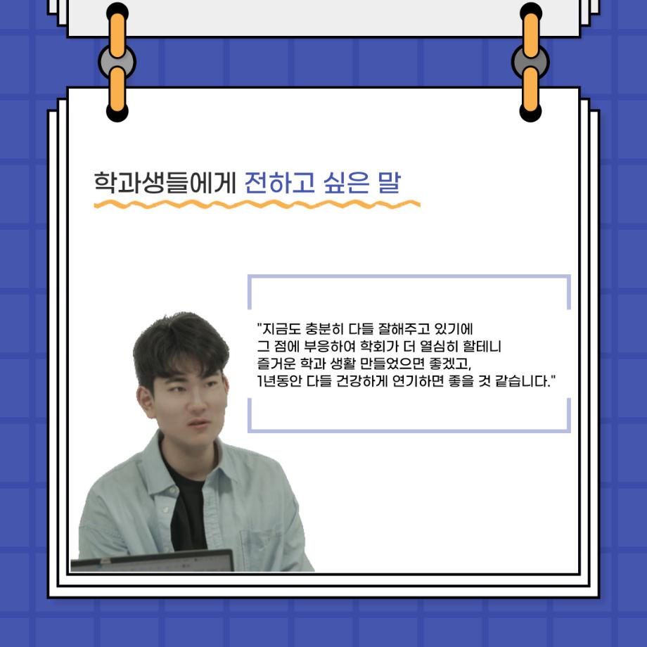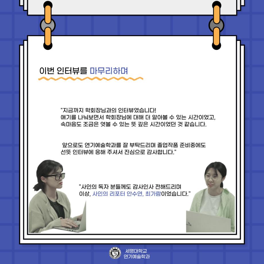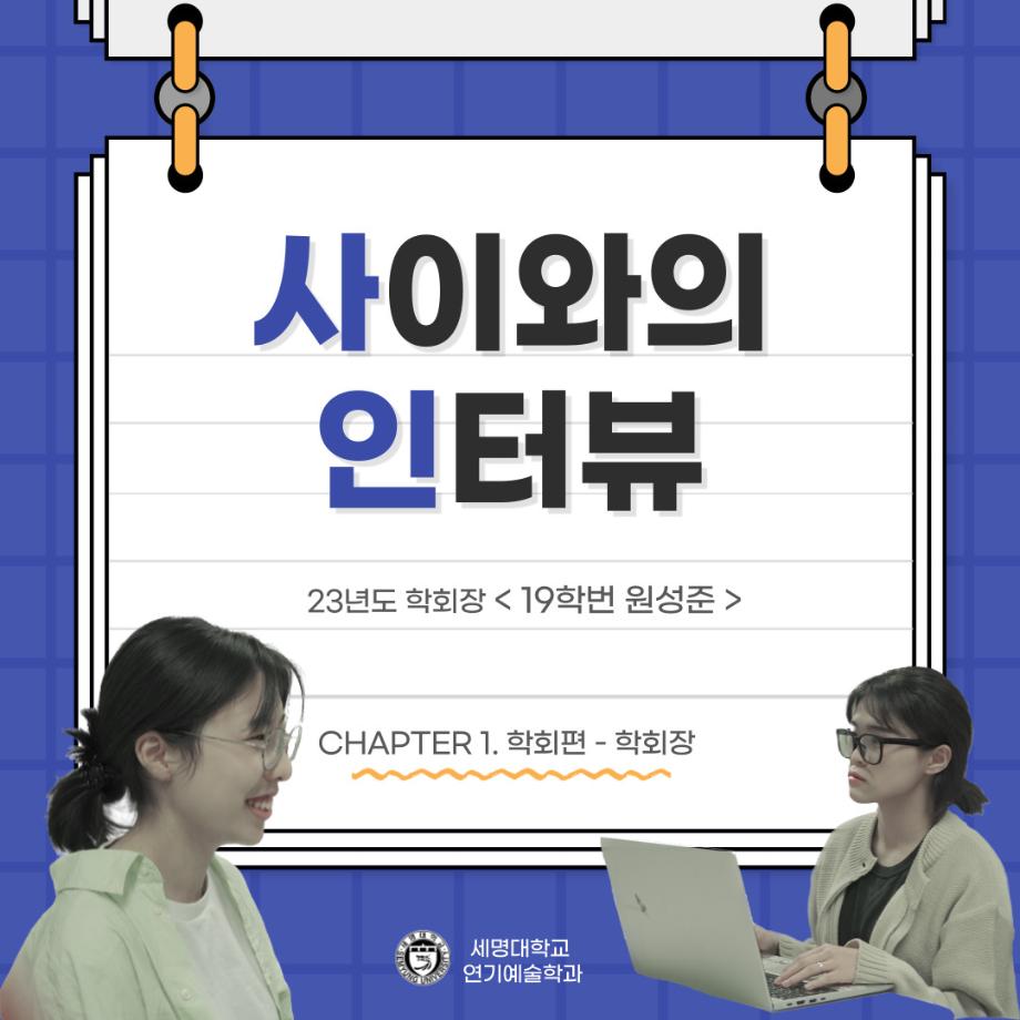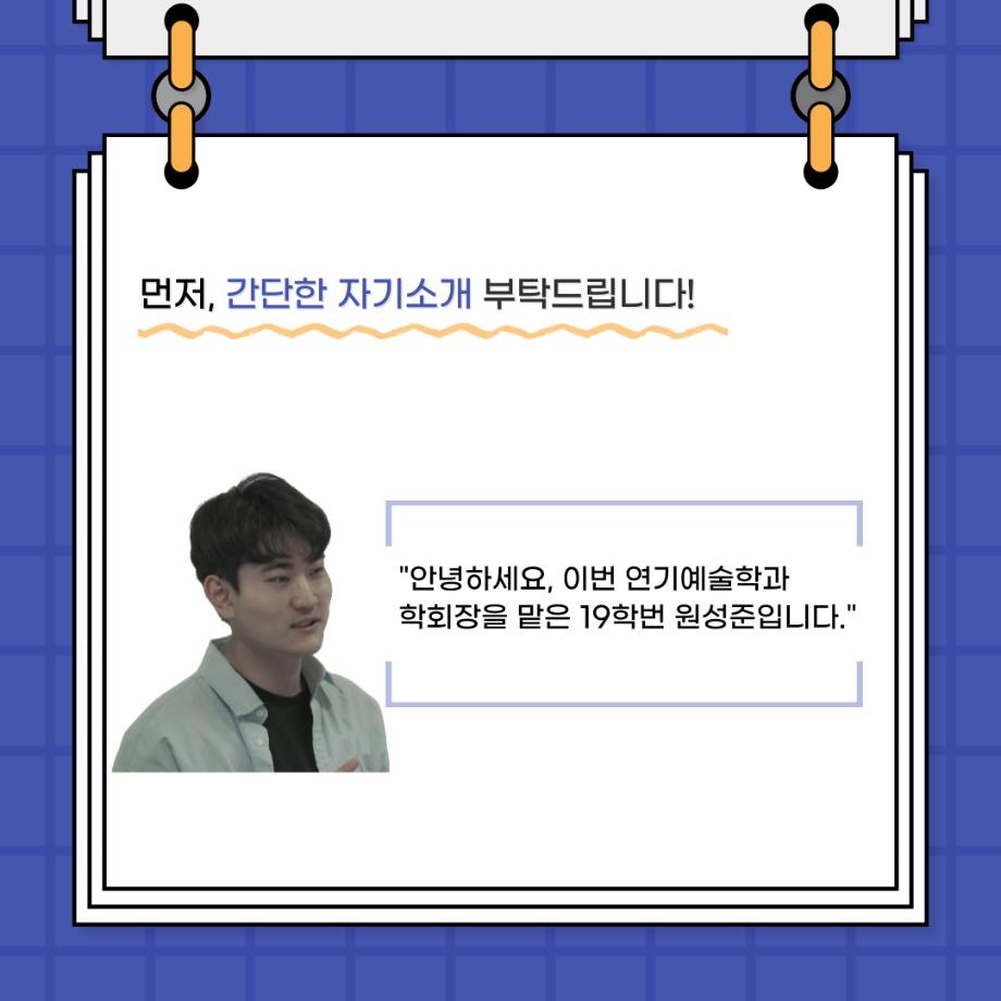 본문 시작 홈으로 커뮤니티 학과소개 입학정보 교수소개 학과과정 커뮤니티 공연예매 안내 홈페이지가이드 포토갤러리 공지사항 포토갤러리 작품DB 동아리 학사일정 학생회 포토갤러리 페이스북 트위터 프린트 🎙사이와의 인터뷰 - 23년도 학회장 ‘원성준’🎙 연기예술학과 2919 2023-05-23 안녕하십니까! 23년도 학회 '사이'입니다. 학회 '사이'의 첫번째 인터뷰로 연기예술학과 23년도 학회장인 원성준 학회장과 인터뷰를 진행했습니다. 학회를 맡은 소감과 학회장이 되기로 결심한 계기, 학과생들에게 전하고 싶은 말 등 다양한 인터뷰를 진행하였습니다. 앞으로 있을 인터뷰 컨텐츠 '사인' 많은 사랑 부탁드립니다. 목록 이전[2023-1학기] 원격수업사이버강좌 기말고사 시험 진행 안내 모바일응시불가 다음 [밀어주는 위원회] 2023년 꿈 실현 장학금 신청 안내 담당부서 : 연기예술학과 담당자 : - 연락처 : 043-649-1733 최종수정일 : 2024-10-26 만족도조사 만족도 조사 이 페이지에서 제공하는 정보에 대하여 만족하시나요? 매우만족 만족 보통 불만족 매우불만족