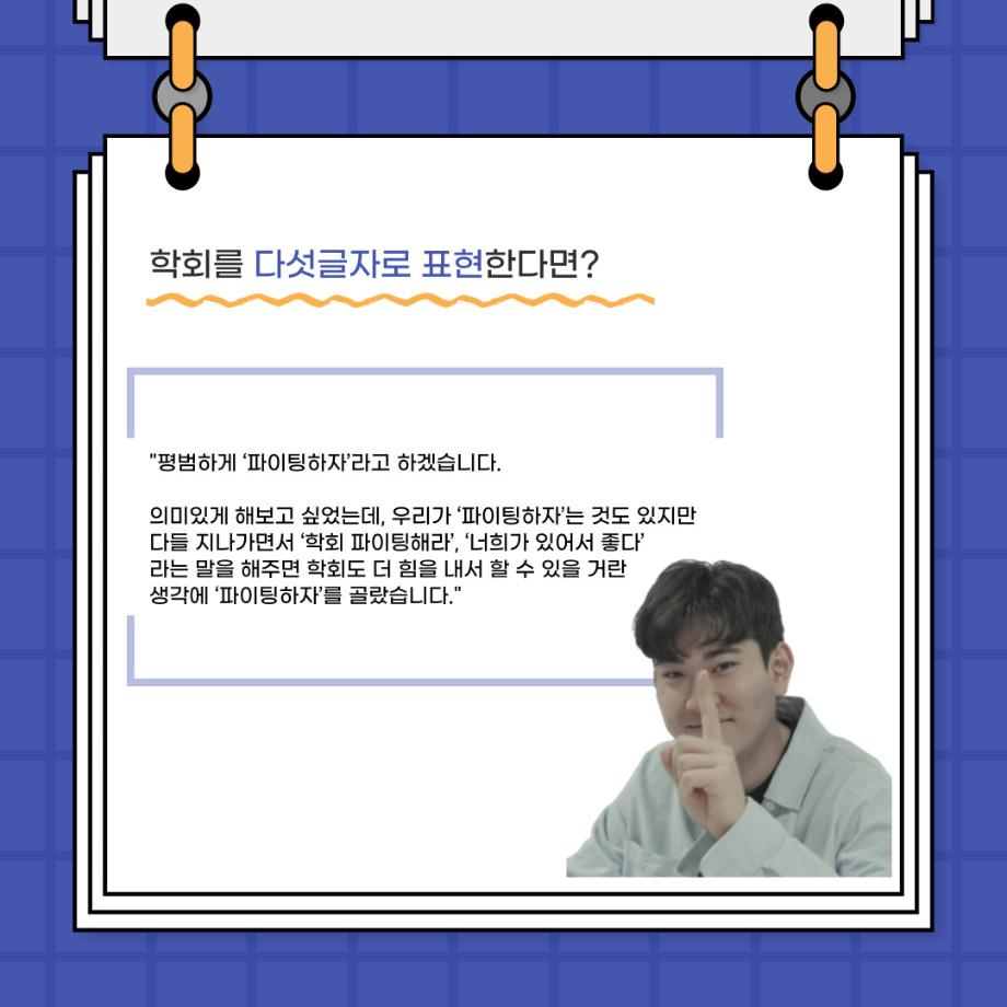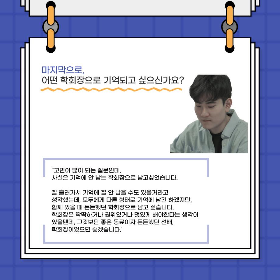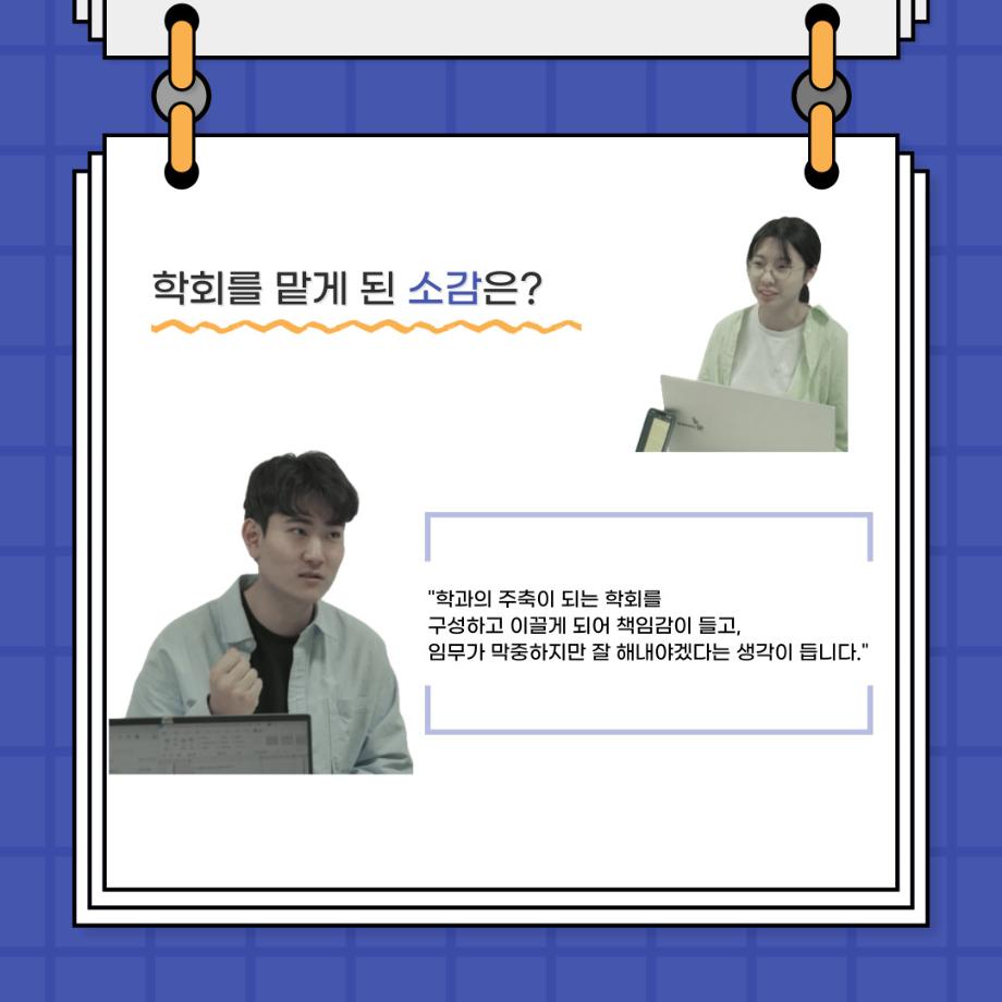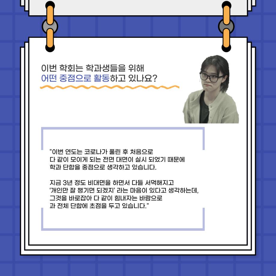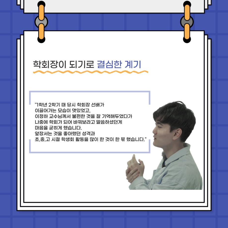 본문 시작 홈으로 커뮤니티 학과소개 입학정보 교수소개 학과과정 커뮤니티 공연예매 안내 홈페이지가이드 포토갤러리 공지사항 포토갤러리 작품DB 동아리 학사일정 학생회 포토갤러리 페이스북 트위터 프린트 🎙사이와의 인터뷰 - 23년도 학회장 ‘원성준’🎙 연기예술학과 2919 2023-05-23 안녕하십니까! 23년도 학회 '사이'입니다. 학회 '사이'의 첫번째 인터뷰로 연기예술학과 23년도 학회장인 원성준 학회장과 인터뷰를 진행했습니다. 학회를 맡은 소감과 학회장이 되기로 결심한 계기, 학과생들에게 전하고 싶은 말 등 다양한 인터뷰를 진행하였습니다. 앞으로 있을 인터뷰 컨텐츠 '사인' 많은 사랑 부탁드립니다. 목록 이전[2023-1학기] 원격수업사이버강좌 기말고사 시험 진행 안내 모바일응시불가 다음 [밀어주는 위원회] 2023년 꿈 실현 장학금 신청 안내 담당부서 : 연기예술학과 담당자 : - 연락처 : 043-649-1733 최종수정일 : 2024-10-26 만족도조사 만족도 조사 이 페이지에서 제공하는 정보에 대하여 만족하시나요? 매우만족 만족 보통 불만족 매우불만족