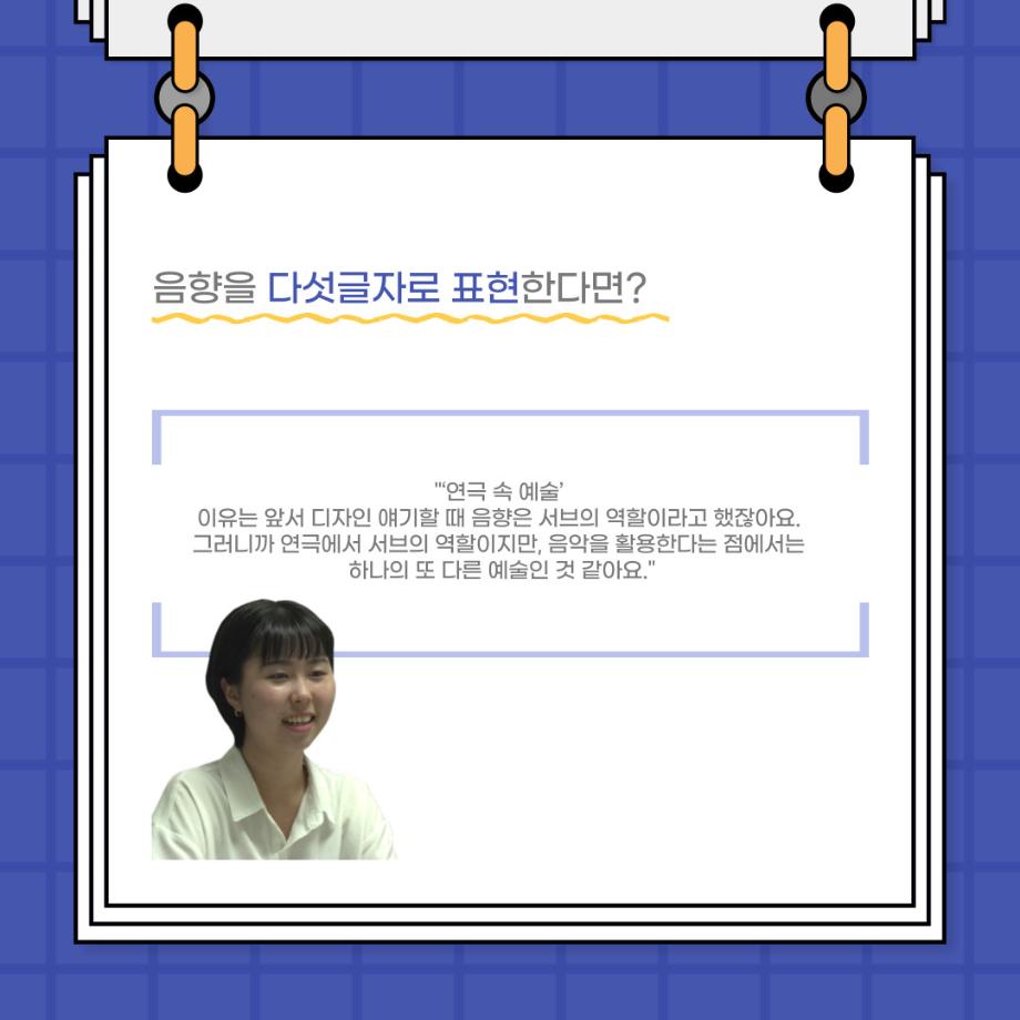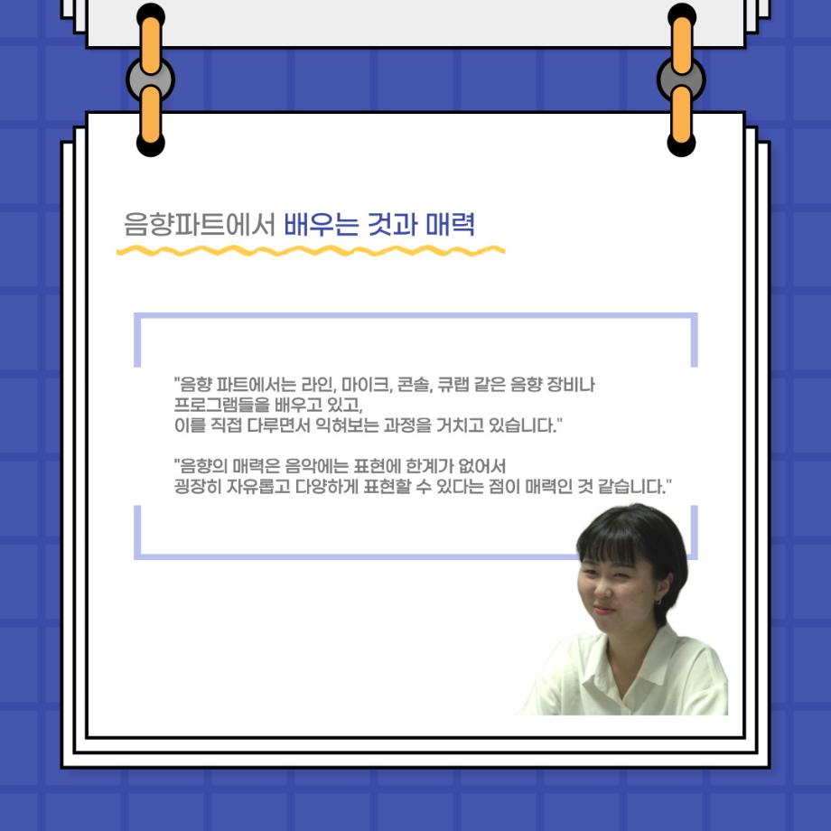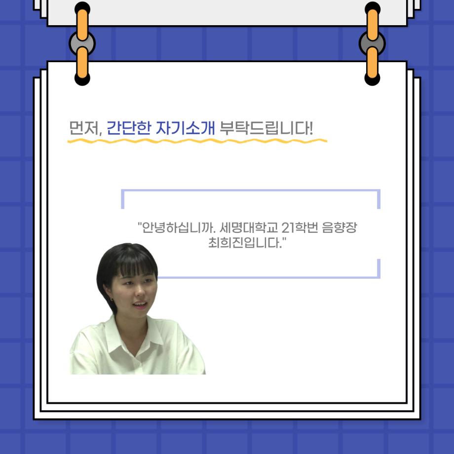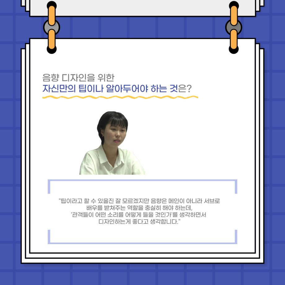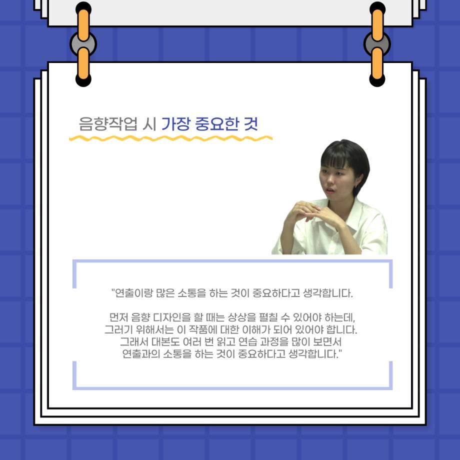 본문 시작 홈으로 커뮤니티 학과소개 입학정보 교수소개 학과과정 커뮤니티 공연예매 안내 홈페이지가이드 포토갤러리 공지사항 포토갤러리 작품DB 동아리 학사일정 학생회 포토갤러리 페이스북 트위터 프린트 사이와의 인터뷰 - 23년도 음향장 ‘최희진‘ 연기예술학과 3352 2023-07-24 안녕하십니까! 23년도 학회 ‘사이’입니다! 학회 ‘사이’의 다섯번째 인터뷰로 연기예술학과 23년도 음향장인 최희진 학생과 인터뷰하는 시간을 가졌습니다! 이번 인터뷰에서는 음향에 대한 매력과 음향 작업에서 가장 중요한 것, 음향 작업에서 알아두어야 하는 것 등에 대해 인터뷰하였습니 앞으로 있을 인터뷰 컨텐츠 ‘사인’도 많은 사랑 부탁드립니다. 목록 이전제 97회 세명대학교 연기예술학과 정기공연 하계 프로젝트 < 첼로와 케찹 > 다음 제 98회 세명대학교 연기예술학과 정기공연 하계 프로젝트 - < 하녀들 > 담당부서 : 연기예술학과 담당자 : - 연락처 : 043-649-1733 최종수정일 : 2024-10-26 만족도조사 만족도 조사 이 페이지에서 제공하는 정보에 대하여 만족하시나요? 매우만족 만족 보통 불만족 매우불만족