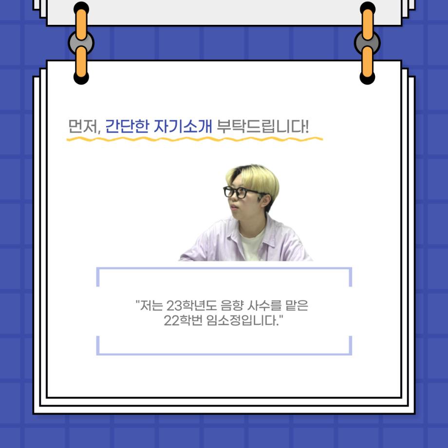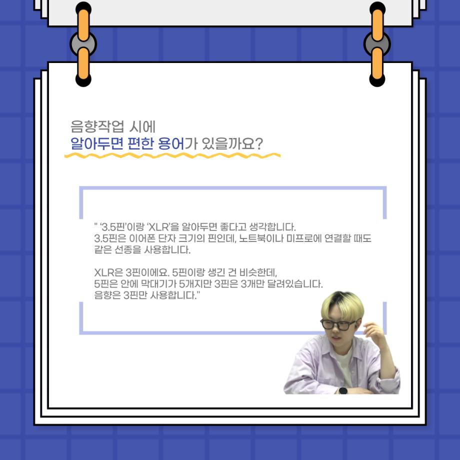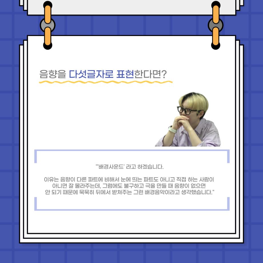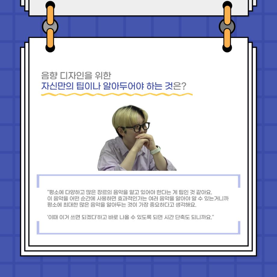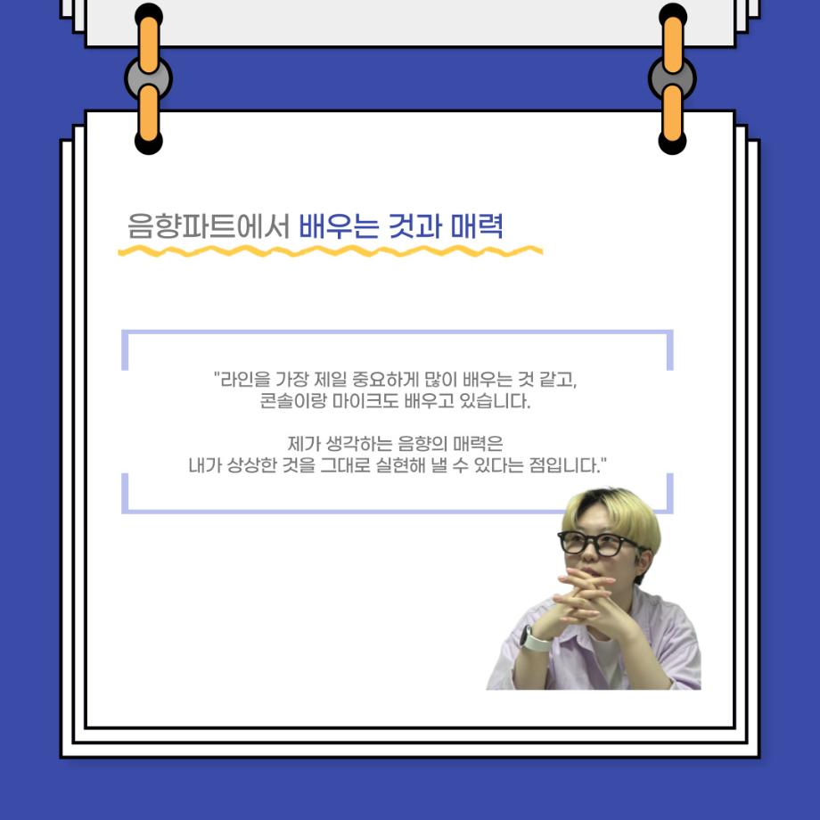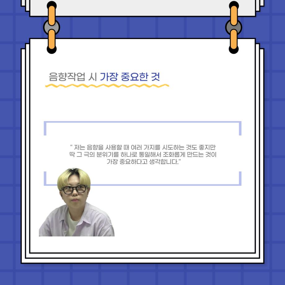 본문 시작 홈으로 커뮤니티 학과소개 입학정보 교수소개 학과과정 커뮤니티 공연예매 안내 홈페이지가이드 포토갤러리 공지사항 포토갤러리 작품DB 동아리 학사일정 학생회 포토갤러리 페이스북 트위터 프린트 사이와의 인터뷰 - 23년도 음향 사수 '임소정' 연기예술학과 3643 2023-08-09 안녕하십니까. 23년도 학회 ‘사이’입니다. 학회 ‘사이’의 여섯번째 인터뷰로 연기예술학과 23년도 음향 사수인 임소정 학생과 인터뷰하는 시간을 가졌습니다. 이번 인터뷰에서는 음향에 대한 매력과 음향 작업에서 가장 중요한 것, 음향 작업에서 알아두어야 하는 것 등에 대해 인터뷰하였습니다. 앞으로 있을 인터뷰 컨텐츠 ‘사인’ 많은 사랑 부탁드립니다. 목록 다음 2023학년도 1학기 하계 현장실습 ‘어드벤쳐프로젝트’ 다음 제14회 서울 청소년 연극축제 담당부서 : 연기예술학과 담당자 : - 연락처 : 043-649-1733 최종수정일 : 2024-10-26 만족도조사 만족도 조사 이 페이지에서 제공하는 정보에 대하여 만족하시나요? 매우만족 만족 보통 불만족 매우불만족