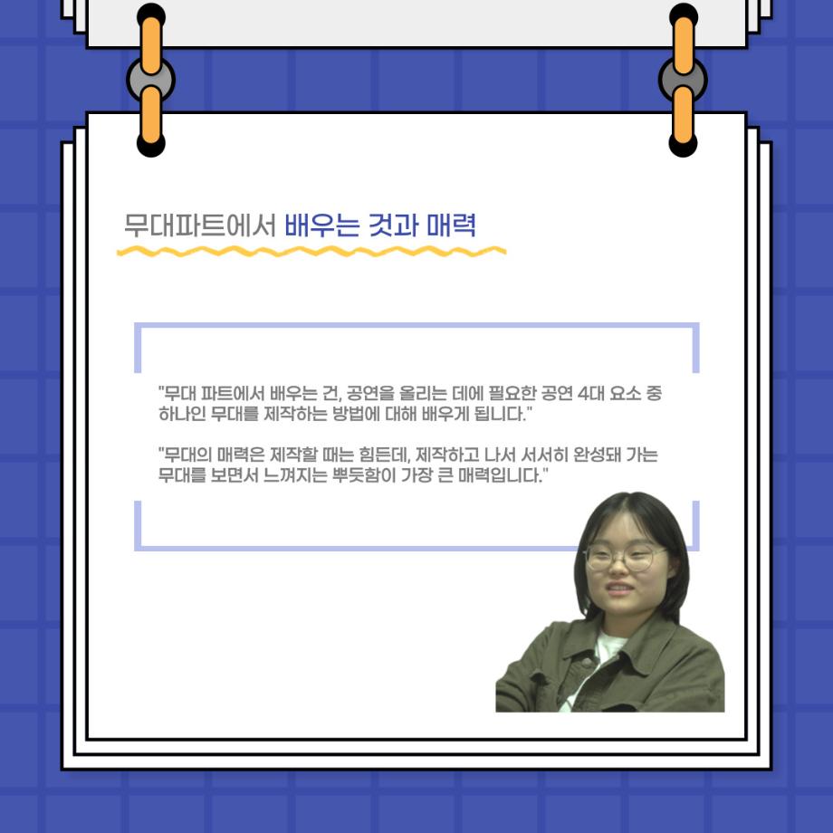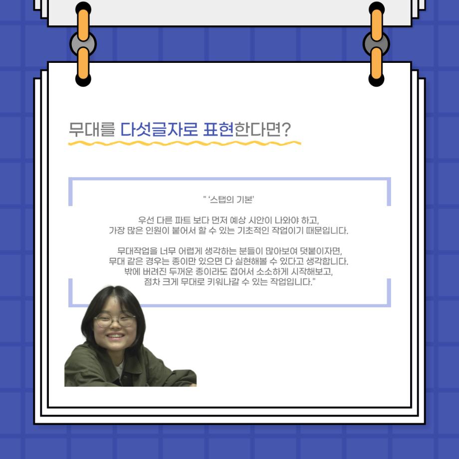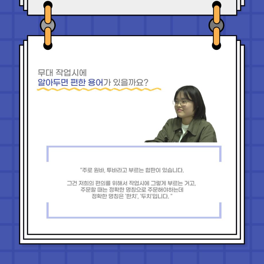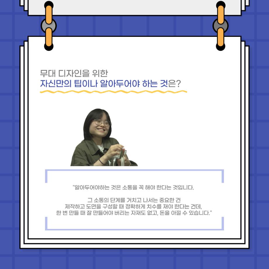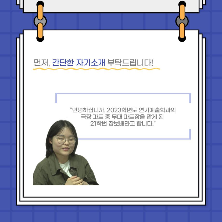 본문 시작 홈으로 커뮤니티 학과소개 입학정보 교수소개 학과과정 커뮤니티 공연예매 안내 홈페이지가이드 포토갤러리 공지사항 포토갤러리 작품DB 동아리 학사일정 학생회 포토갤러리 페이스북 트위터 프린트 사이와의 인터뷰 - 23년도 무대장 ‘장보배‘ 연기예술학과 3853 2023-08-21 안녕하십니까! 23년도 학회 ‘사이’입니다! 학회 ‘사이’의 일곱번째 인터뷰로 연기예술학과 23년도 무대장인 장보배 학생과 인터뷰하는 시간을 가졌습니다. 이번 인터뷰에서는 무대 파트의 매력과 무대 작업시 가장 중요한 것, 무대 작업에서 알아두어야 하는 것 등에 대해 인터뷰하였습니다. 다음 인터뷰 컨텐츠 ‘사인’도 많은 사랑 부탁드립니다. 목록 이전제 96회 세명대학교 연기예술학과 정기공연 하계 프로젝트 - < d0nut > 다음 제 97회 세명대학교 연기예술학과 정기공연 '하계 프로젝트' < 첼로와 케찹 > 담당부서 : 연기예술학과 담당자 : - 연락처 : 043-649-1733 최종수정일 : 2024-10-26 만족도조사 만족도 조사 이 페이지에서 제공하는 정보에 대하여 만족하시나요? 매우만족 만족 보통 불만족 매우불만족