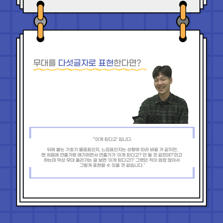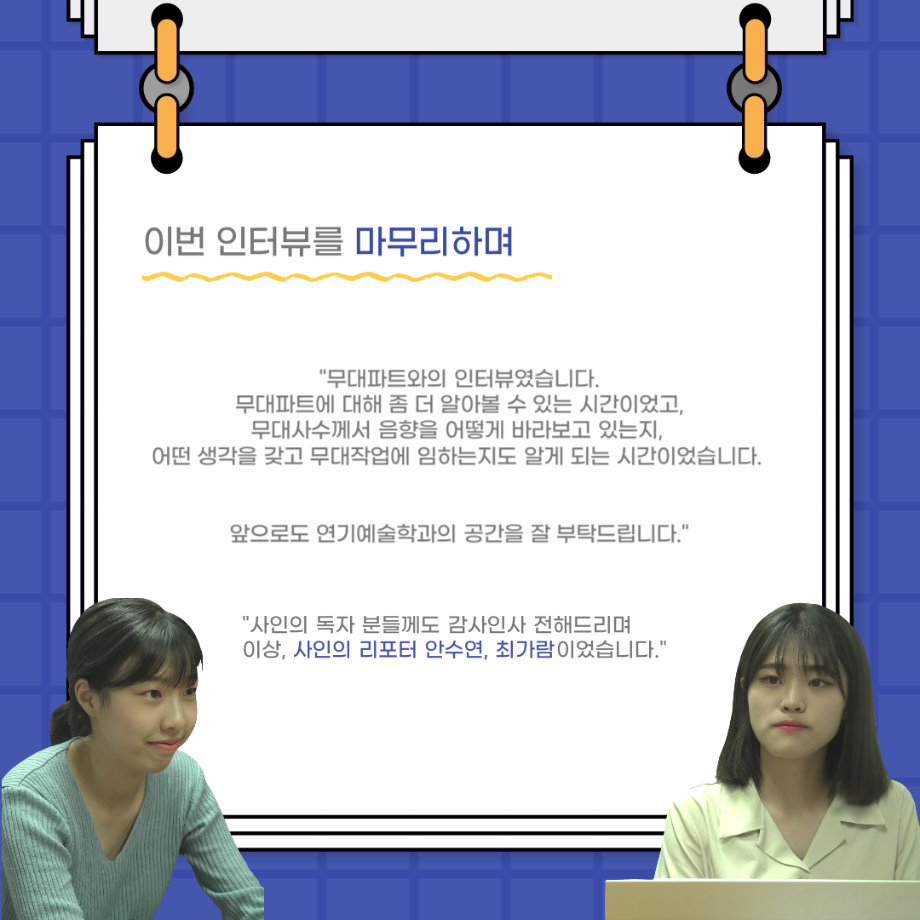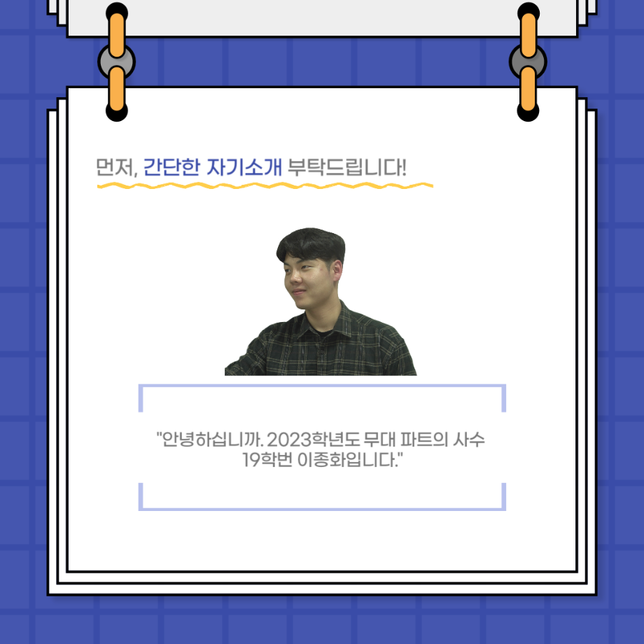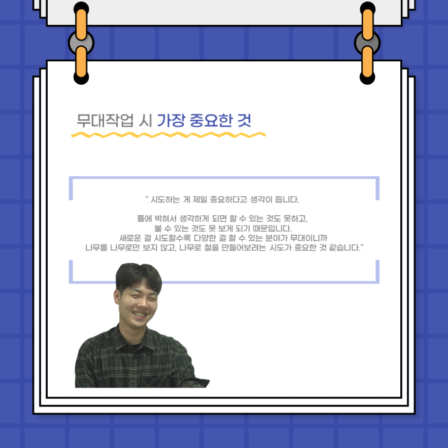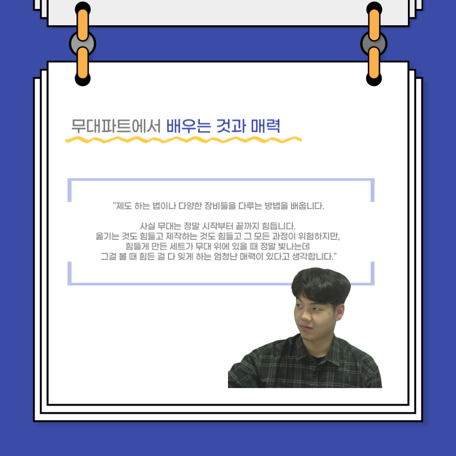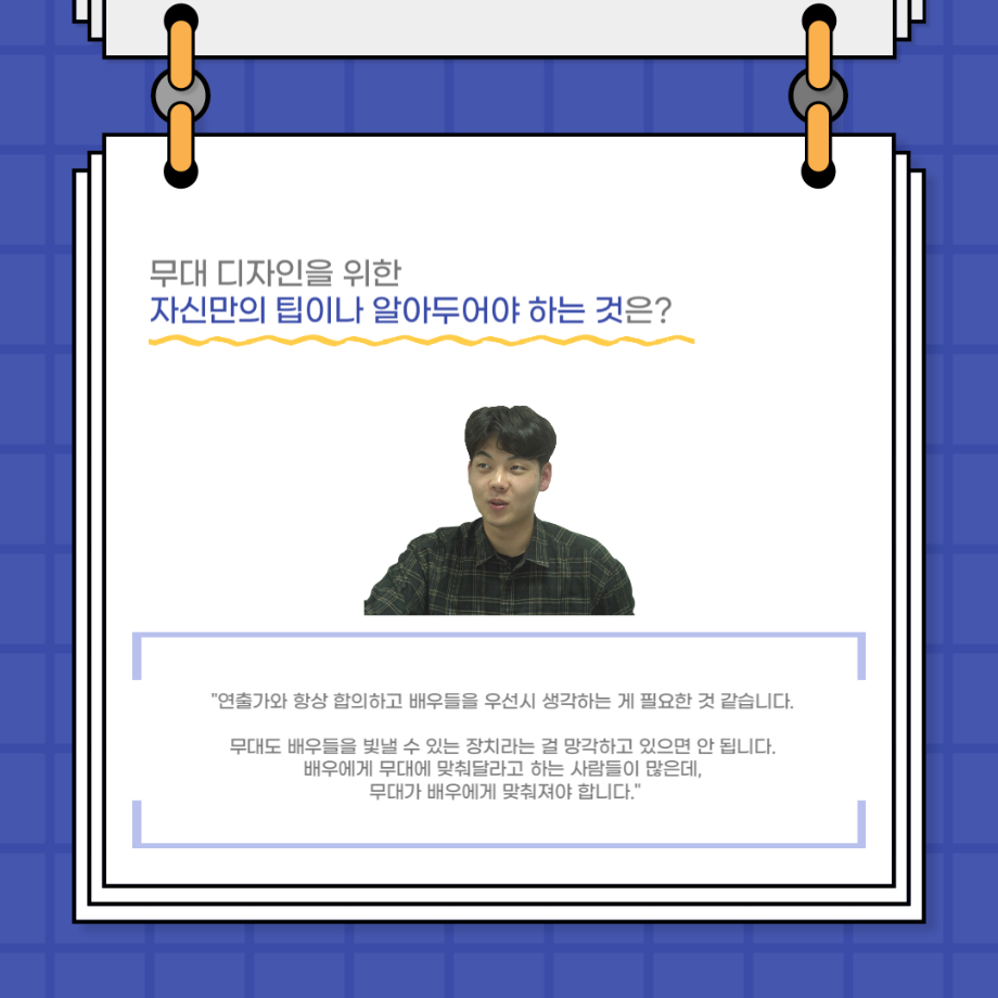 본문 시작 홈으로 커뮤니티 학과소개 입학정보 교수소개 학과과정 커뮤니티 공연예매 안내 홈페이지가이드 포토갤러리 공지사항 포토갤러리 작품DB 동아리 학사일정 학생회 포토갤러리 페이스북 트위터 프린트 사이와의 인터뷰 - 23년도 무대사수 ‘이종화’ 연기예술학과 3929 2023-08-31 안녕하십니까. 23년도 학회 ‘사이’입니다! 학회 ‘사이’의 여덟번째 인터뷰로 연기예술학과 23년도 무대사수인 이종화 학생과 인터뷰하는 시간을 가졌습니다. 이번 인터뷰에서는 무대 파트의 매력과 무대 작업시 가장 중요한 것, 무대 작업에서 알아두어야 하는 것 등에 대해 인터뷰하였습니다. 다음 인터뷰 컨텐츠 ‘사인’도 많은 사랑 부탁드립니다. 목록 이전사이와의 인터뷰 - 23년도 부학회장 ‘심명균’ 다음 ★제5회 세명진로Festival 자기소개서 특강 모집안내★ 담당부서 : 연기예술학과 담당자 : - 연락처 : 043-649-1733 최종수정일 : 2024-10-26 만족도조사 만족도 조사 이 페이지에서 제공하는 정보에 대하여 만족하시나요? 매우만족 만족 보통 불만족 매우불만족
