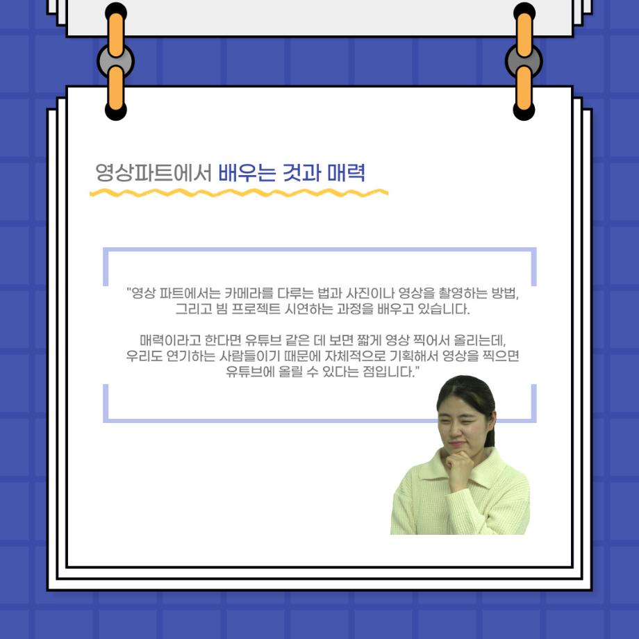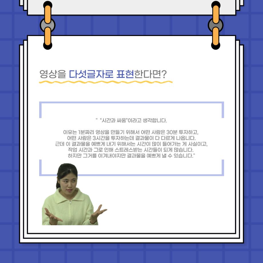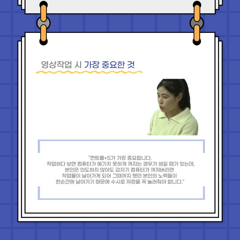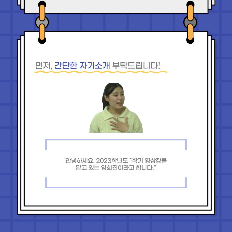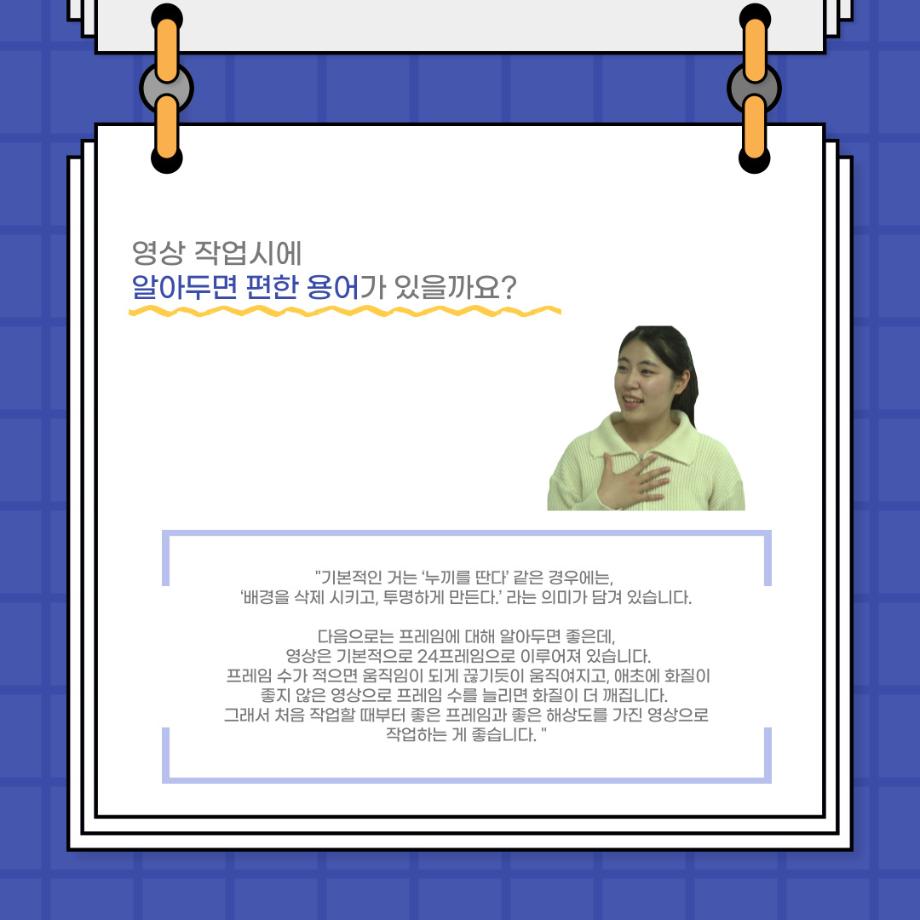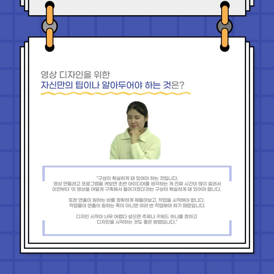 본문 시작 홈으로 커뮤니티 학과소개 입학정보 교수소개 학과과정 커뮤니티 공연예매 안내 홈페이지가이드 포토갤러리 공지사항 포토갤러리 작품DB 동아리 학사일정 학생회 포토갤러리 페이스북 트위터 프린트 사이와의 인터뷰 - 23년도 영상장 ‘양희진‘ 연기예술학과 3474 2023-10-13 안녕하십니까. 23년도 학회 ‘사이’입니다. 학회 ‘사이’의 아홉번째 인터뷰로 연기예술학과 23년도 1학기 영상장인 양희진 학생과 인터뷰하는 시간을 가졌습니다. 이번 인터뷰에서는 영상 파트의 매력과 영상 작업시 가장 중요한 것, 영상 작업에서 알아두어야 하는 것 등에 대해 인터뷰하였습니다. 다음 인터뷰 컨텐츠 ‘사인’도 많은 사랑 부탁드립니다. 목록 이전2학기 맞이 학과 대청소 다음 사이와의 인터뷰 - 23년도 영상사수 ‘안지민‘ 담당부서 : 연기예술학과 담당자 : - 연락처 : 043-649-1733 최종수정일 : 2024-10-26 만족도조사 만족도 조사 이 페이지에서 제공하는 정보에 대하여 만족하시나요? 매우만족 만족 보통 불만족 매우불만족