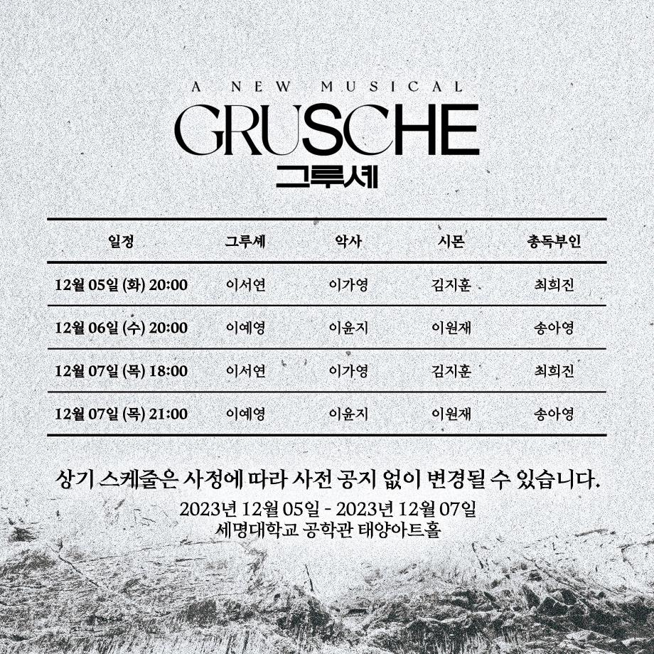 본문 시작 홈으로 커뮤니티 학과소개 입학정보 교수소개 학과과정 커뮤니티 공연예매 안내 홈페이지가이드 포토갤러리 공지사항 포토갤러리 작품DB 동아리 학사일정 학생회 포토갤러리 페이스북 트위터 프린트 제 101회 세명대학교 연기예술학과 뮤지컬제작실습 <Grusche> 포스터 & 예매링크 & 캐스트 연기예술학과 2959 2023-11-30 선으로 향한 유혹은 얼마나 끔찍한가 𝐀 𝐍𝐄𝐖 𝐌𝐔𝐒𝐈𝐂𝐀𝐋 <𝐆𝐫𝐮𝐬𝐜𝐡𝐞> - 인스타그램 @musical_grusche www.instagram.com/musical_grusche - 세명대학교 연기예술학과 뮤지컬제작실습 뮤지컬 <그루셰> 2023. 12. 05 20:00 2023. 12. 06 20:00 2023. 12. 07 18:00 / 21:00 세명대학교 공학관 태양아트홀 목록 이전[재학생필독]2024학년도 1학기 국가장학금 및 국가근로장학금 1차 신청 안내 다음 제100회 세명대학교 연기예술학과 정기공연 2학년 <중급연기 관찰발표회> 포스터 담당부서 : 연기예술학과 담당자 : - 연락처 : 043-649-1733 최종수정일 : 2024-10-26 만족도조사 만족도 조사 이 페이지에서 제공하는 정보에 대하여 만족하시나요? 매우만족 만족 보통 불만족 매우불만족