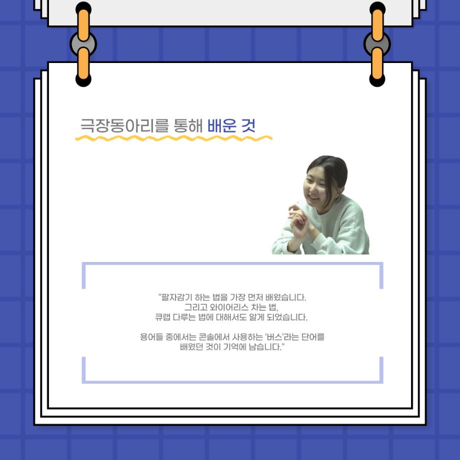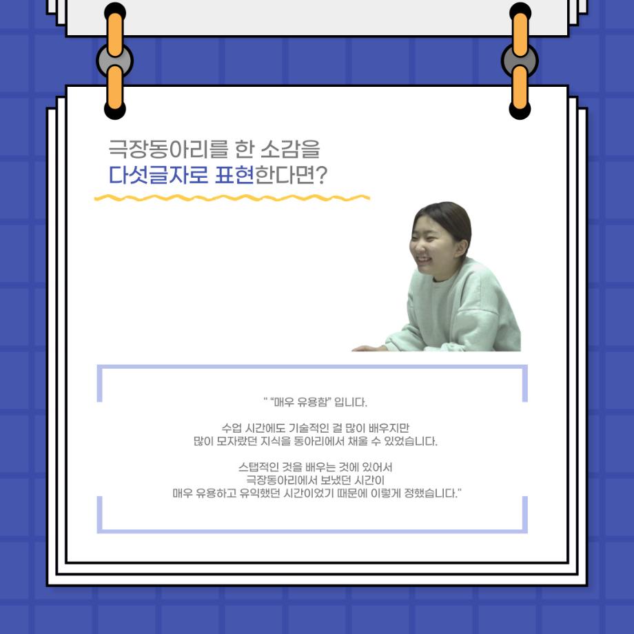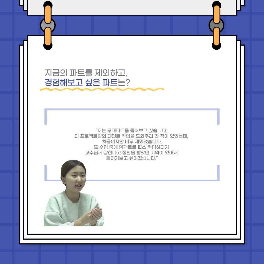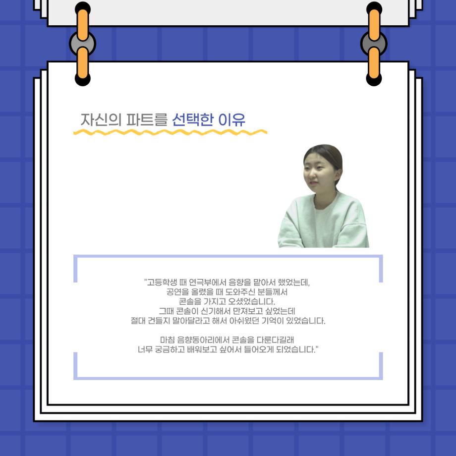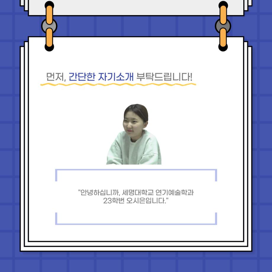 본문 시작 홈으로 커뮤니티 학과소개 입학정보 교수소개 학과과정 커뮤니티 공연예매 안내 홈페이지가이드 포토갤러리 공지사항 포토갤러리 작품DB 동아리 학사일정 학생회 포토갤러리 페이스북 트위터 프린트 사이와의 인터뷰 - 23년도 극장동아리 음향 파트 부원 ‘오시은‘ 연기예술학과 2862 2024-01-19 안녕하십니까. 23년도 학회 ‘사이’입니다. 학회 ‘사이’의 열다섯번째 인터뷰로 연기예술학과 23년도 극장동아리 음향 파트 부원인 오시은 학생과 인터뷰하는 시간을 가졌습니다. 이번 인터뷰에서는 음향파트를 선택한 이유, 극장동아리를 통해 배운 것, 동아리를 하면서 기억에 남는 활동이나 일화 등에 대해 인터뷰하였습니다. 다음 인터뷰 컨텐츠 ‘사인’도 많은 사랑 부탁드립니다. 목록 이전제102회 세명대학교 연기예술학과 정기공연 1학년 <에쮸드 발표회> 공연 성료 다음 찾아가는 충북 도립극단 설명회 담당부서 : 연기예술학과 담당자 : - 연락처 : 043-649-1733 최종수정일 : 2024-10-26 만족도조사 만족도 조사 이 페이지에서 제공하는 정보에 대하여 만족하시나요? 매우만족 만족 보통 불만족 매우불만족
