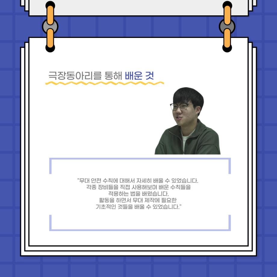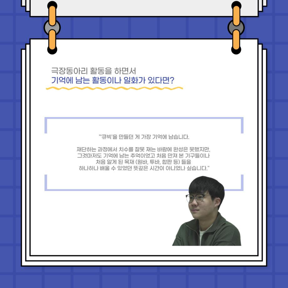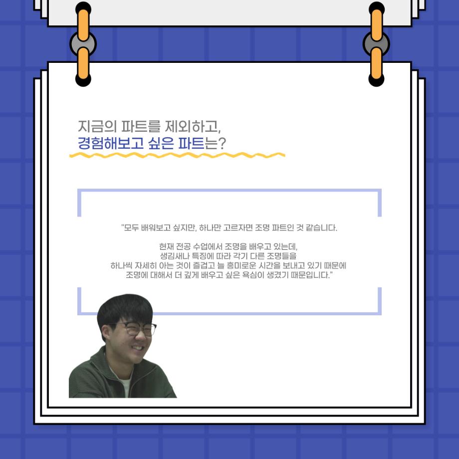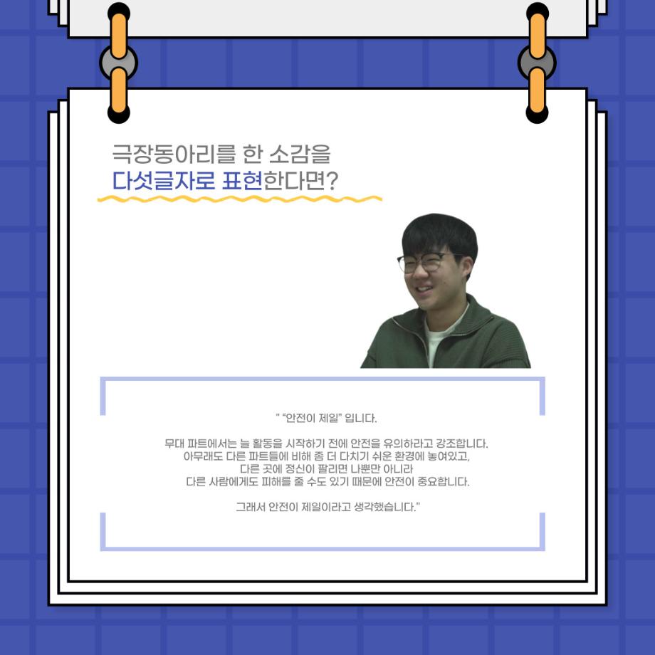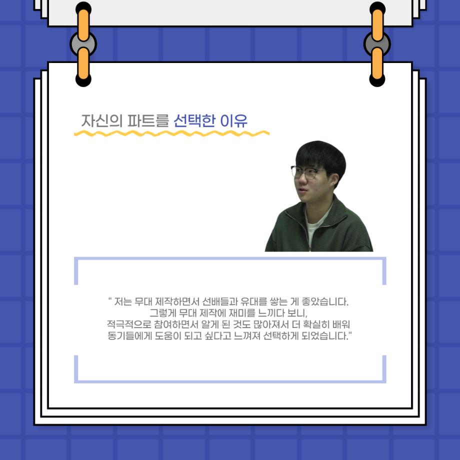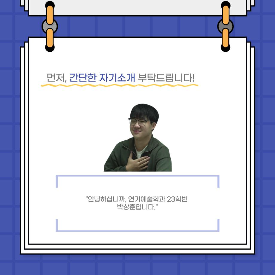 본문 시작 홈으로 커뮤니티 학과소개 입학정보 교수소개 학과과정 커뮤니티 공연예매 안내 홈페이지가이드 포토갤러리 공지사항 포토갤러리 작품DB 동아리 학사일정 학생회 포토갤러리 페이스북 트위터 프린트 사이와의 인터뷰 - 23년도 극장동아리 무대 파트 부원 ‘박상훈‘ 연기예술학과 3016 2024-01-25 안녕하십니까. 23년도 학회 ‘사이’입니다. 학회 ‘사이’의 열일곱번째 인터뷰로 연기예술학과 23년도 극장동아리 무대 파트 부원인 박상훈 학생과 인터뷰하는 시간을 가졌습니다. 이번 인터뷰에서는 무대파트를 선택한 이유, 극장동아리를 통해 배운 것, 동아리를 하면서 기억에 남는 활동이나 일화 등에 대해 인터뷰하였습니다. 다음 인터뷰 컨텐츠 ‘사인’도 많은 사랑 부탁드립니다. 목록 이전사이와의 인터뷰 - 23년도 극장동아리 무대 파트 부원 ‘정지운‘ 다음 사이와의 인터뷰 - 23년도 극장동아리 영상 파트 부원 ‘김준희‘ 담당부서 : 연기예술학과 담당자 : - 연락처 : 043-649-1733 최종수정일 : 2024-10-26 만족도조사 만족도 조사 이 페이지에서 제공하는 정보에 대하여 만족하시나요? 매우만족 만족 보통 불만족 매우불만족