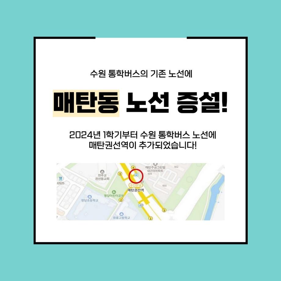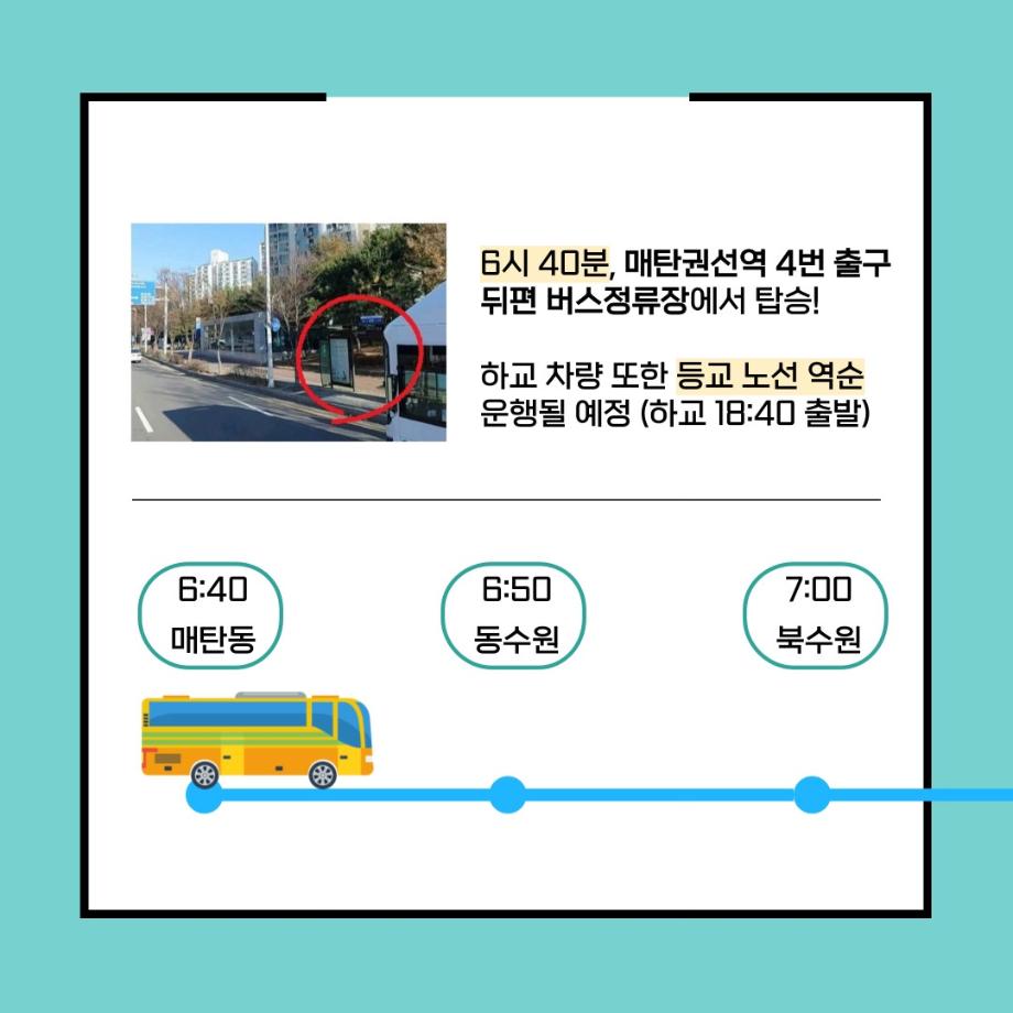 본문 시작 홈으로 커뮤니티 학과소개 입학정보 교수소개 학과과정 커뮤니티 공연예매 안내 홈페이지가이드 포토갤러리 공지사항 포토갤러리 작품DB 동아리 학사일정 학생회 포토갤러리 페이스북 트위터 프린트 세명대 통학버스, 경기 수원지역 노선 증설 연기예술학과 3326 2024-01-30 경기 수원지역 통학버스 노선에 매탄동 노선이 새롭게 증설되었습니다. 6시 40분, 매탄권선역 4번 출구 뒤편 버스정류장에서 탑승해 기존 노선(동수원, 북수원)을 지나 세명대학교까지 단숨에 하교 버스도 등고 버스 노선의 역순으로 운행된다는 사실. 더 편리해진 통학버스 타고 세명대학교로 등교하자. 목록 이전세명대학교 연기예술학과 특강 [최진영 배우님] 다음 세명대학교 연기예술학과 특강 [김낙형 연출가님] 담당부서 : 연기예술학과 담당자 : - 연락처 : 043-649-1733 최종수정일 : 2024-10-26 만족도조사 만족도 조사 이 페이지에서 제공하는 정보에 대하여 만족하시나요? 매우만족 만족 보통 불만족 매우불만족